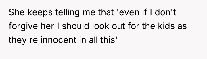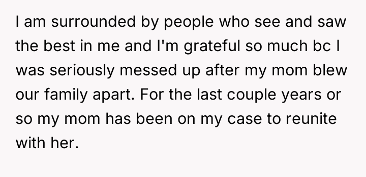 The original poster (OP) is struggling with deep, unresolved anger and unforgiveness stemming from their mother's decision to abruptly end the marriage and force the OP out of the home. While the OP has successfully built a financially secure life with the supportive side of the family, the mother continues to pressure the OP, using guilt related to the younger half-siblings as leverage to demand involvement.
