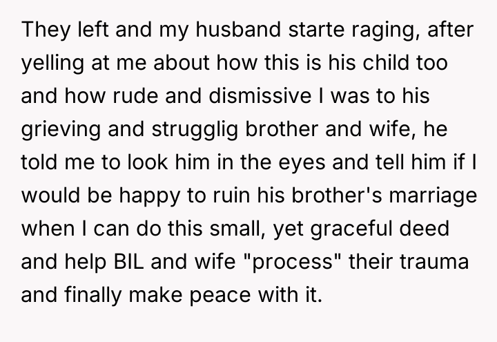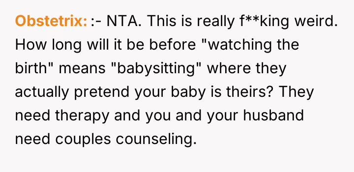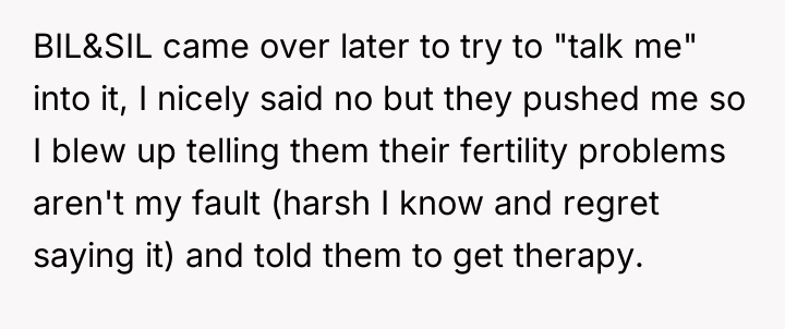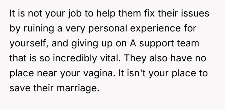 As renowned family therapist Dr. Lori Gottlieb explains, “Boundaries are not about controlling other people; they are about knowing what is acceptable for you and communicating it clearly.” In this scenario, the OP established a clear boundary regarding attendance in the delivery room, which is universally recognized as a deeply personal and intimate medical event. The husband's action of 'volunteering' his spot directly violated this boundary and demonstrated a severe lack of respect for his wife’s autonomy during a vulnerable time. The in-laws’ repeated insistence, despite the OP’s initial polite refusal, shows a failure to respect her 'no.' While their grief over infertility is genuine and warrants compassion, attempting to co-opt the OP's pregnancy experience as a means of 'processing their trauma' crosses an ethical line. The husband’s aggressive reaction, accusing the OP of selfishness and threatening to withhold communication until she complies, indicates a significant power imbalance and a failure in partnership, placing the perceived needs of his brother over the physical and emotional well-being of his wife and unborn child. The OP’s initial harsh response, while regrettable in its delivery, was an understandable emotional reaction to feeling betrayed and pressured. Professionally, the OP was appropriate in declining the request for attendance. Moving forward, the constructive path involves the OP and her husband seeking couples counseling immediately to address the broken trust and the husband’s enabling behavior. The OP must firmly reiterate that the delivery room is non-negotiable, focusing future discussions on equitable support systems for the in-laws that do not infringe upon her personal rights.