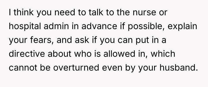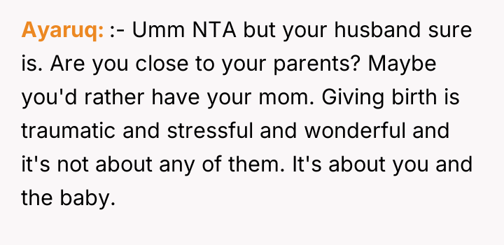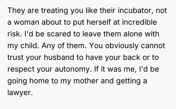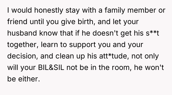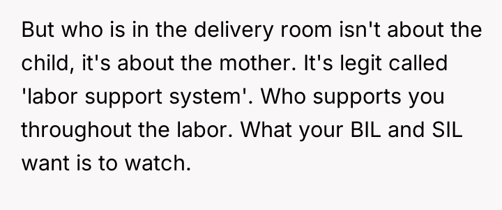 The original poster (OP) is experiencing intense anger and distress because her husband undermined her boundary regarding who can be present during the birth of their child. The central conflict is between the OP's right to bodily autonomy and privacy during labor versus the desire of her in-laws to vicariously experience childbirth due to their own fertility struggles, a desire which the husband actively supported.