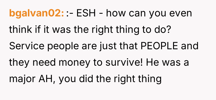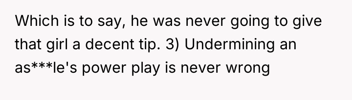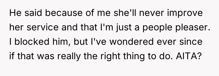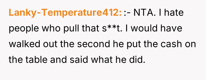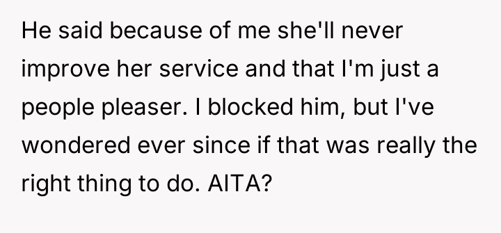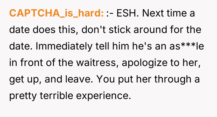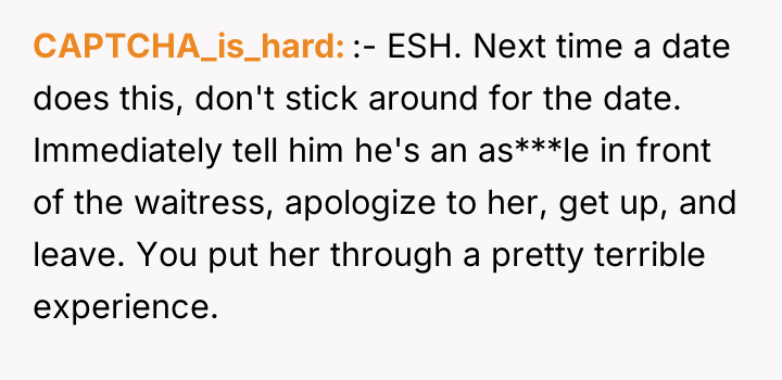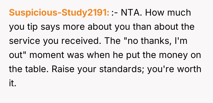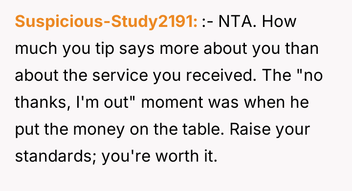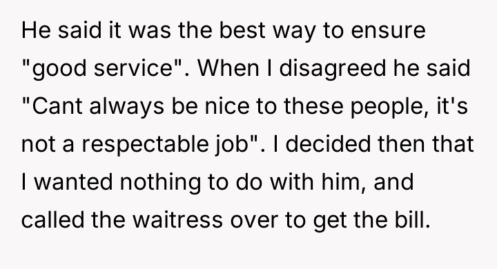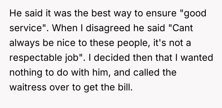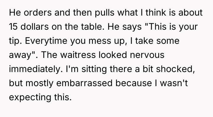 As renowned psychologist Dr. Harriet Lerner explains, “Setting boundaries is about choosing what you will or will not accept from others.” In this scenario, the OP's date established a severe boundary violation—not just for the waitress, but also for the OP, who was complicit in witnessing the interaction. The date's behavior exhibited a profound lack of empathy and respect, framing basic service work as a performance subject to arbitrary financial penalty. The date's actions stem from a rigid, potentially hierarchical mindset that devalues service industry labor. By withholding tips based on perceived 'mistakes,' he shifted the power dynamic entirely, turning a service transaction into a punitive one. The OP correctly identified this behavior as crossing a significant ethical line. The immediate termination of the date and the separate tipping were strong, non-verbal boundary statements affirming the OP's own values regarding respect and human dignity. The OP's actions were entirely appropriate given the immediate ethical breach observed. The realization that a dating partner holds such disrespectful views, particularly regarding vulnerable workers, is critical early information. For future situations, while immediately ending the date is valid, the OP can practice pausing briefly to state clearly, "I disagree with how you are handling this, and I am paying for my share now," before leaving, ensuring their boundary is verbally communicated before blocking.
