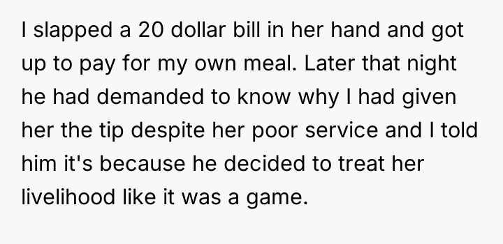 The original poster (OP) faced an immediate moral conflict on a first date when their partner treated the waitress's income as a conditional game based on performance, which deeply troubled the OP. The OP acted to correct what they saw as an unjust and disrespectful action by tipping the waitress directly and then immediately ending the date.