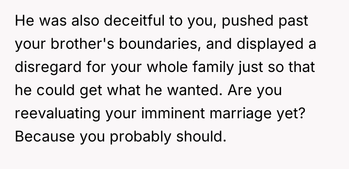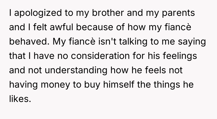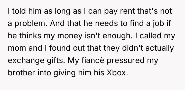 The core conflict centers on the fiancée's perceived entitlement and poor handling of his job insecurity, demonstrated by his decision to pressure the brother into an unfair gift exchange. The original poster (OP) acted out of genuine care for her brother, a gesture which the fiancée responded to with resentment and manipulation, ultimately undermining the OP's generosity and family peace.