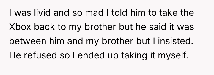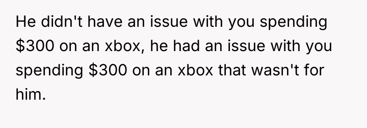 As renowned researcher Dr. Brené Brown explains, “Boundaries are the distance at which I can love you and me simultaneously.” In this situation, the fiancée clearly failed to respect established boundaries concerning both personal property and the emotional needs of others. The fiancée's actions—publicly complaining about his gifts, secretly taking the $300 Xbox, and then actively pressuring a sick brother into an unequal exchange—suggest a significant lack of self-regulation driven by feelings of inadequacy related to his unemployment. The fiancée's defense, shifting blame onto the OP for spending money while he is jobless, attempts to frame his own poor choices as a reaction to the OP's financial decisions, which she confirmed were within her means. This is a classic deflection pattern. Furthermore, his refusal to return the item and subsequent claim that the OP was disrespectful when setting a clear boundary highlights a power struggle where he prioritizes his immediate, unfulfilled desires over the agreed-upon stability and respect within the relationship. The OP acted appropriately by immediately correcting the wrong done to her brother and apologizing to her family. However, the fiancée's behavior is a serious red flag. The constructive recommendation is for the couple to engage in couple's counseling immediately, focusing not just on financial planning, but explicitly on emotional regulation, respect for boundaries, and navigating transitions during unemployment without resorting to manipulation or theft.