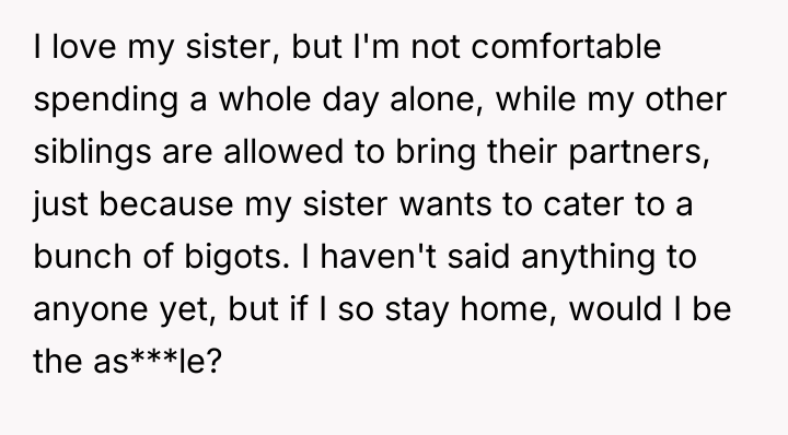 The original poster (OP) is facing a painful conflict where their sister is asking them to attend a wedding alone, seemingly to avoid upsetting the fiancé's conservative family members. The OP feels deeply hurt and slighted by this exclusion, especially since other siblings are permitted to bring partners, viewing this as a failure to stand up for their relationship against prejudice.
