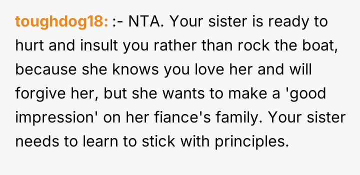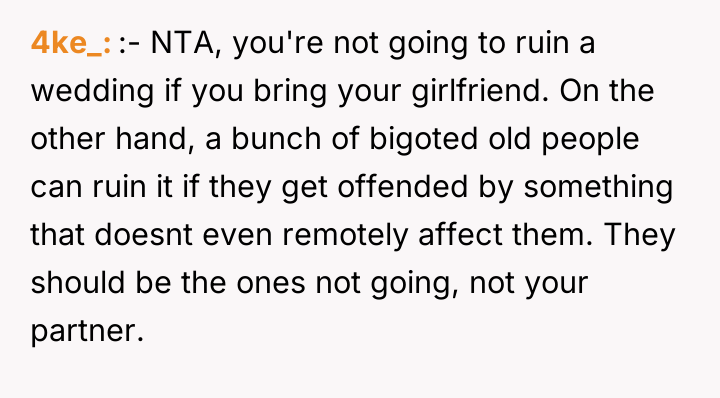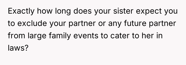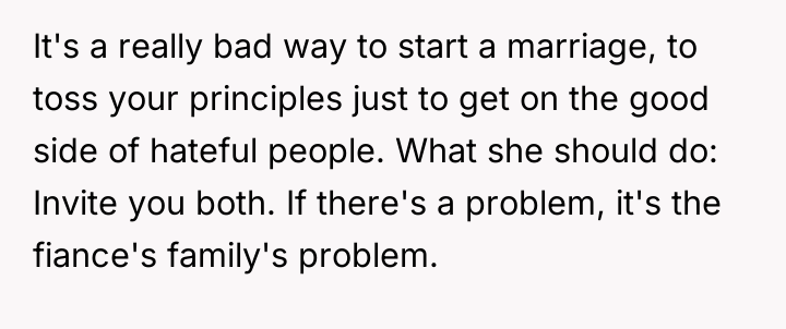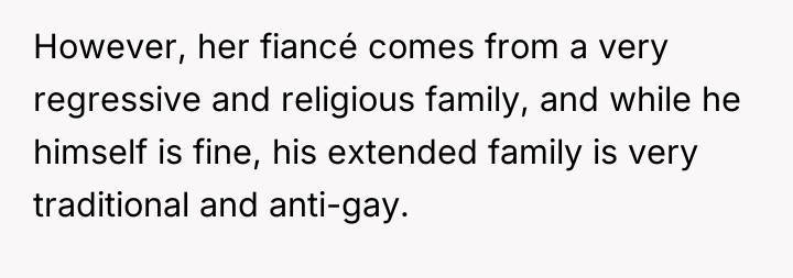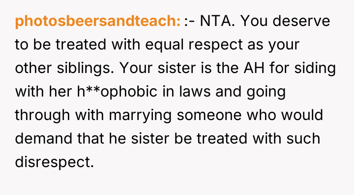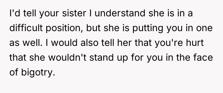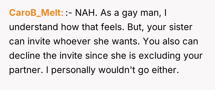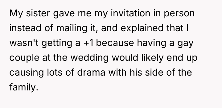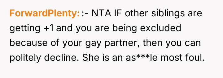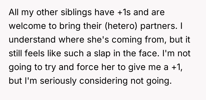 As renowned researcher Dr. Brené Brown explains, “Boundaries are the distance at which I can love you and me simultaneously.” This situation highlights a significant boundary violation and an issue of emotional labor placed upon the OP. The sister, prioritizing the comfort of her fiancé’s extended, anti-gay relatives over her sibling’s dignity, has implicitly demanded that the OP perform emotional labor by attending alone and appearing as a single guest to appease external prejudice. The exclusion of the OP's partner while granting plus-ones to heterosexual siblings creates a clear hierarchy of validation, which is understandably perceived as a deep personal insult. The OP’s primary motivation for potentially declining is self-respect and refusal to tacitly endorse discriminatory treatment. The OP’s feeling of being slighted is entirely valid; the sister’s choice is a transactional one that compromises the OP's relationship visibility. While skipping the wedding avoids the immediate discomfort of isolation, it might strain the primary sibling bond. A constructive recommendation for future interactions would be for the OP to communicate their feelings clearly to the sister privately, focusing on the impact of the unequal guest list—not as an ultimatum, but as a statement of personal value—and then make a decision based on whether the sister shows any willingness to acknowledge the unfairness, even if the wedding seating cannot change.