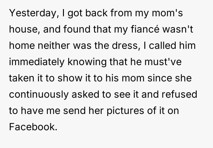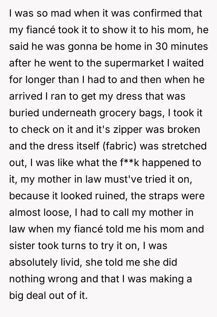 The original poster (OP) is facing a significant breach of trust and boundaries regarding a very personal item, her wedding dress. Her emotional distress stems from her fiancé enabling his mother to try on and subsequently damage the dress, directly contradicting the OP's stated wishes and expectations for the garment.