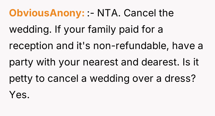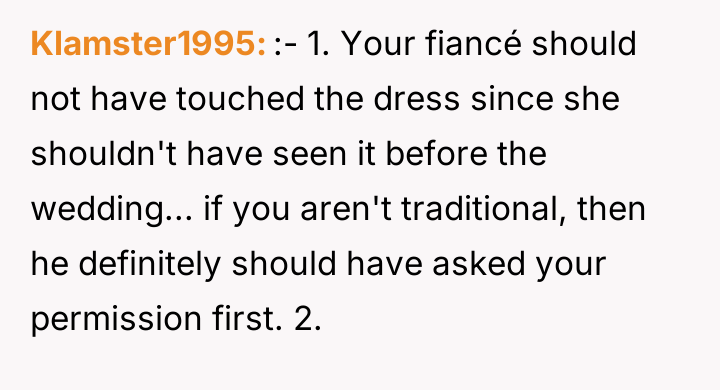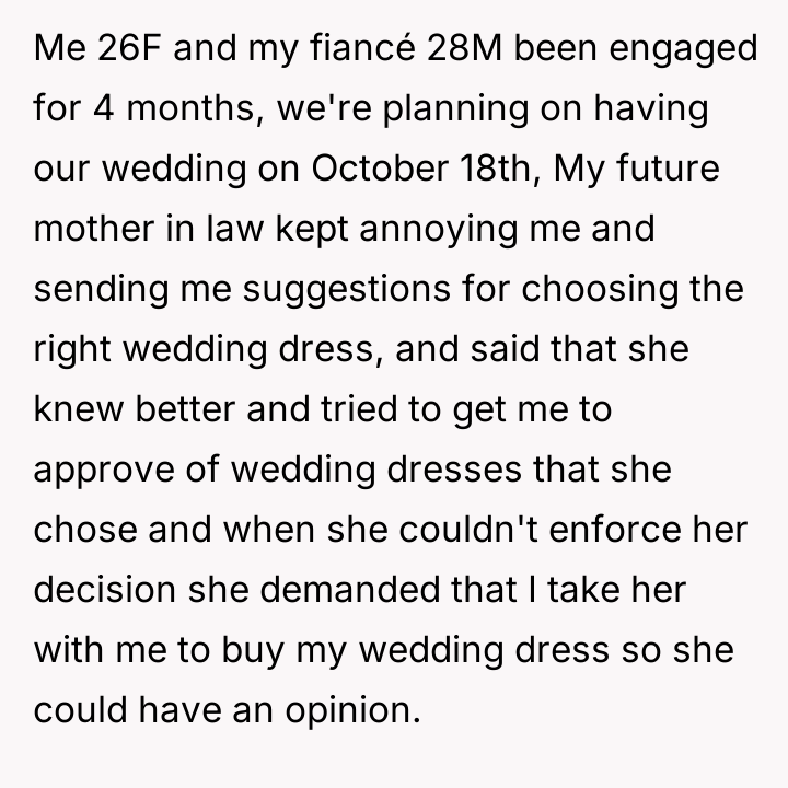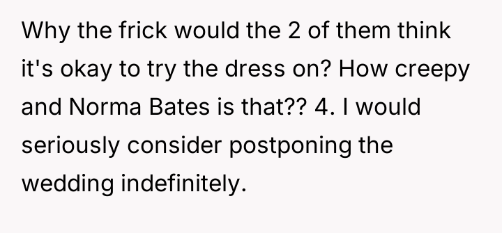 As renowned researcher Dr. Brené Brown explains, “Boundaries are the distance at which I can love you and me simultaneously.” This situation represents a profound failure of both internal and interpersonal boundaries. The OP clearly communicated her desire to control the wedding dress selection process, first by avoiding the mother-in-law's direct involvement and then by storing the dress safely. The fiancé undermined this boundary entirely by unilaterally taking the dress to his mother, effectively prioritizing his mother’s demands over his fiancée’s autonomy and feelings. The motivations here involve control and enmeshment. The mother-in-law exhibited controlling behavior regarding wedding decisions, a common dynamic in pre-wedding stress, but the fiancé's action elevates this from simple nagging to active complicity in a boundary violation. His failure to protect the OP's property and feelings is deeply damaging to the engagement's foundation. The OP's reaction—demanding replacement costs and considering postponing the wedding—is a natural, albeit extreme, response to feeling disrespected and betrayed by her partner. The OP's anger is justified as the dress is symbolic. While fixing the zipper might be possible, the emotional damage from another person wearing it is not easily repaired. Professionally, the fiancé's action was inappropriate and demonstrated a failure in partnership. For future conflict resolution, the OP and her fiancé must immediately address the trust deficit, perhaps with couples counseling, focusing on establishing non-negotiable areas of autonomy where the fiancé must act as a unified front with the OP against external pressure.