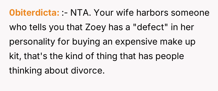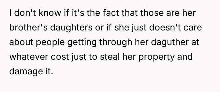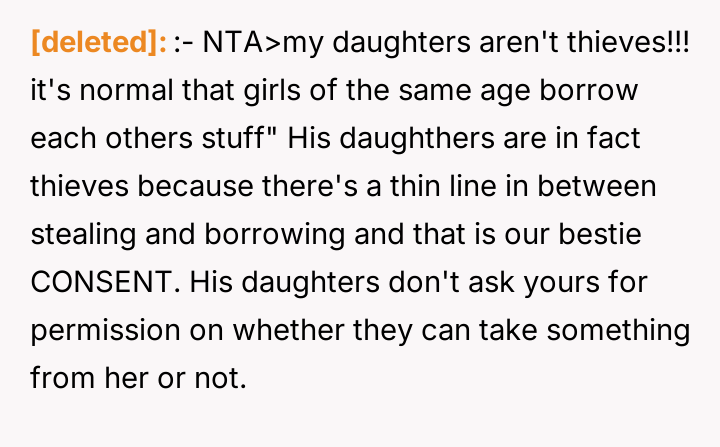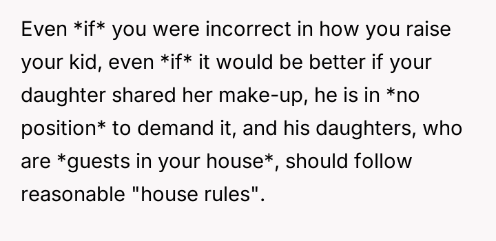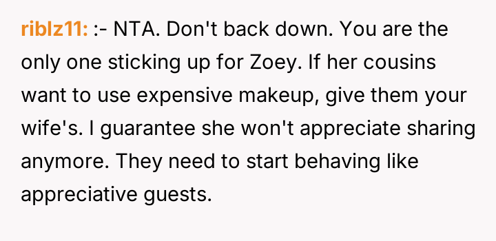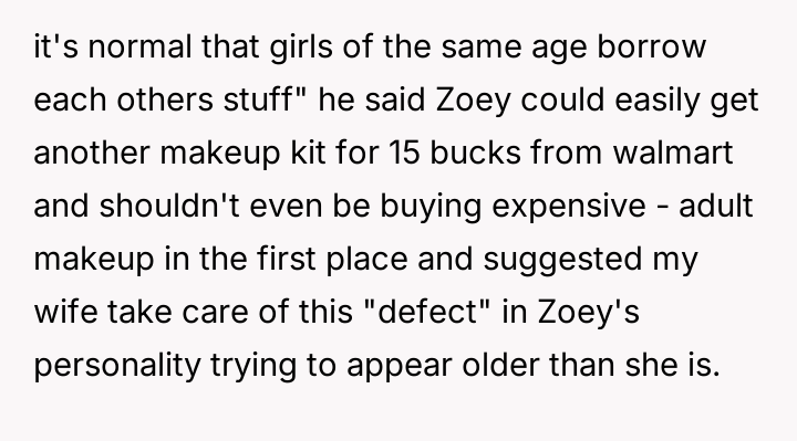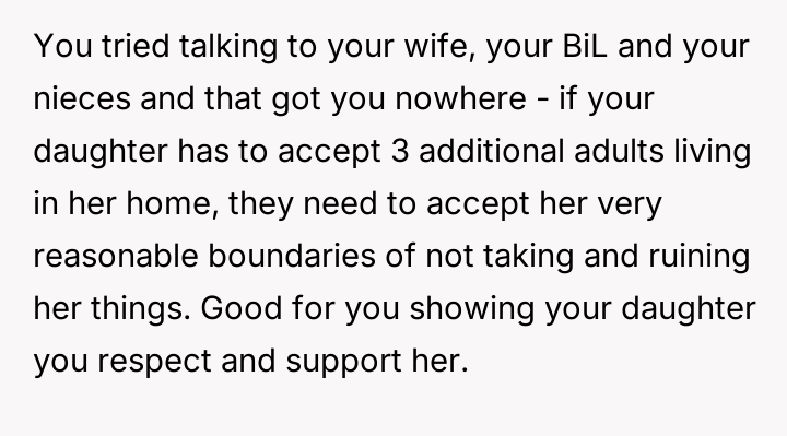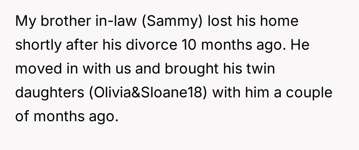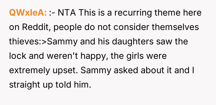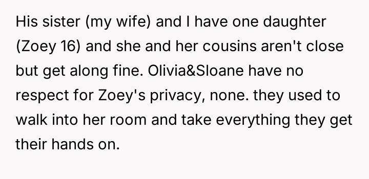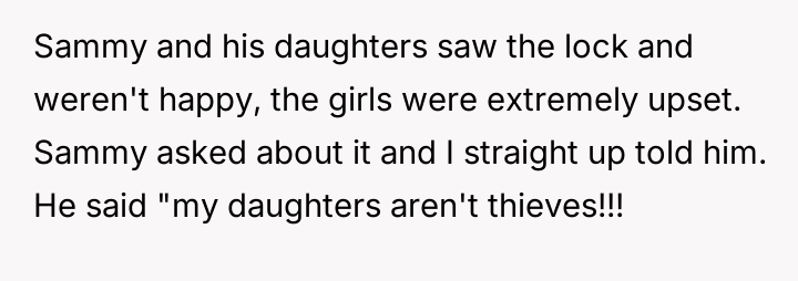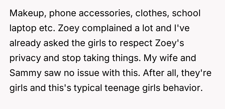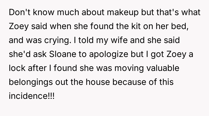 As renowned family therapist and researcher Dr. Virginia Satir notes, "Feelments are facts." In this situation, the OP correctly recognized and acted upon the factual feeling of invasion and loss experienced by his daughter, Zoey, while his wife and brother-in-law invalidated those feelings by dismissing the actions as normal teenage behavior. The core issue here is a failure to establish clear boundaries within a shared living arrangement, complicated by misplaced loyalties. The OP's installation of the lock, while extreme, was a direct consequence of his perceived lack of support from his wife and the normalization of theft by his brother-in-law. Sammy’s deflection—criticizing Zoey's choice of expensive makeup rather than addressing his daughters' behavior—is a classic diversion tactic that shifts blame away from the offenders. Furthermore, the wife's demand to treat the nieces "like daughters" ignores the fundamental principle that rights, including privacy, must be respected regardless of familial relationship, especially when financial value and emotional security are involved. The OP's action of installing the lock was an understandable, albeit poorly communicated, attempt to enforce necessary boundaries when verbal requests failed. To handle this more effectively in the future, the OP and his wife needed to present a united front regarding house rules *before* the crisis escalated. Moving forward, a constructive recommendation involves immediately scheduling a mediated family meeting (perhaps with a neutral third party if necessary) to define strict, non-negotiable rules regarding personal property and access, which must apply equally to all children residing in the home, regardless of their temporary status.