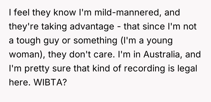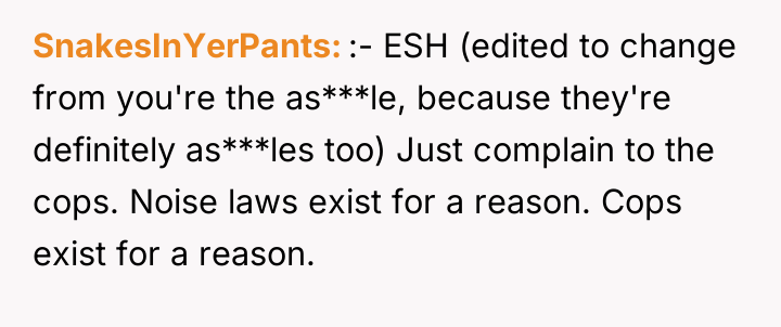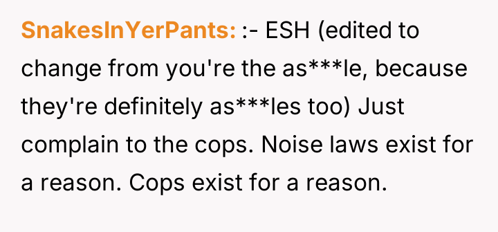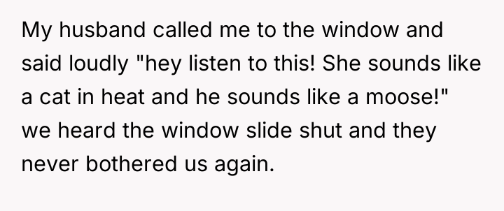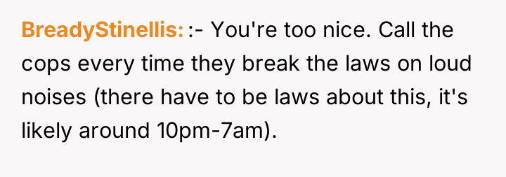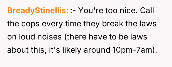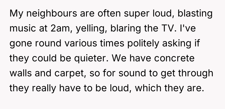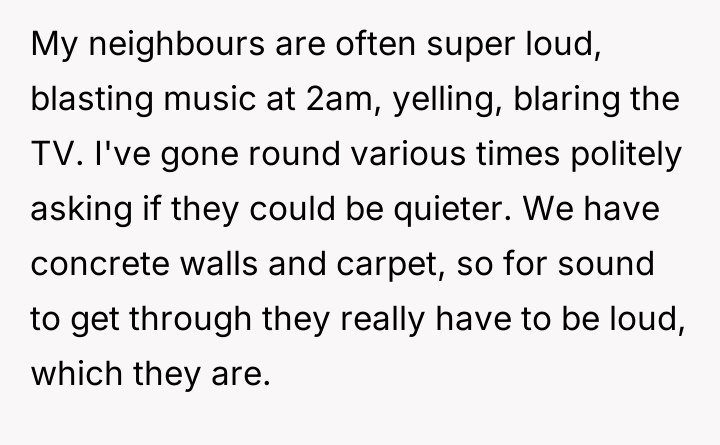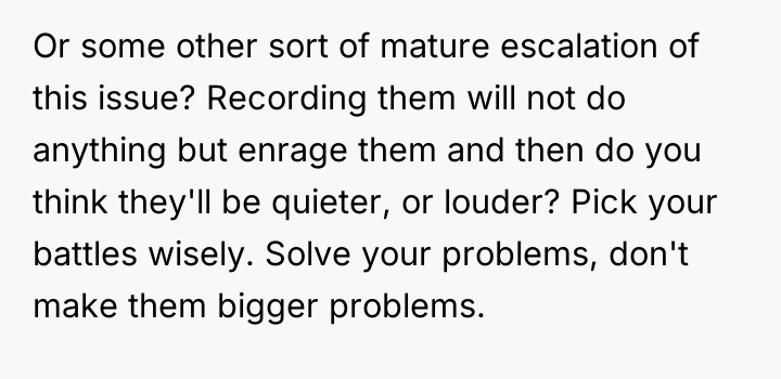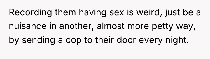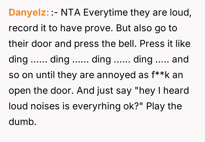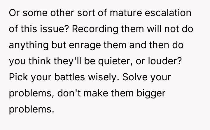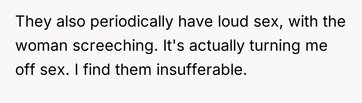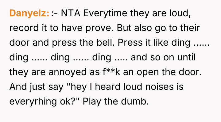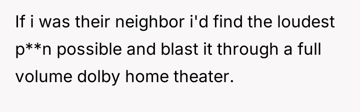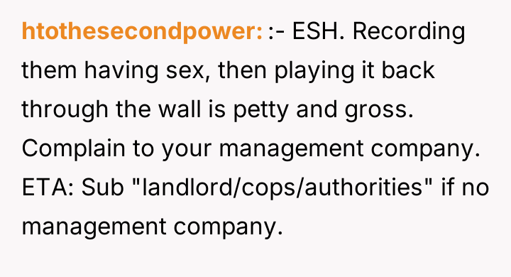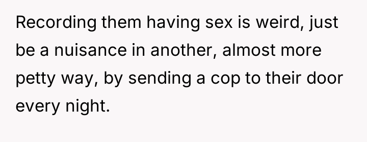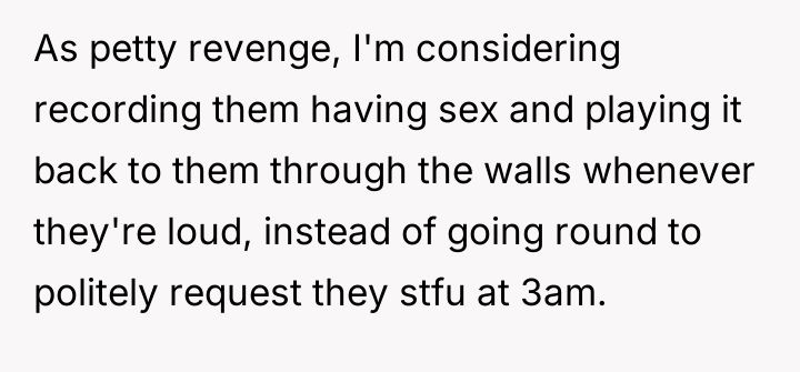 As renowned relationship expert Dr. Terri Orbuch explains, “When people feel their needs are not being met, they may resort to destructive communication patterns rather than constructive ones.” The poster's current situation illustrates a common breakdown in neighborly relations where initial polite requests have failed, leading to feelings of powerlessness and victimization. The neighbors' behavior—blasting loud music and engaging in loud sexual activity late at night—demonstrates a profound lack of consideration and respect for the shared living space. The poster’s perception that they are being targeted because they are perceived as 'mild-mannered' suggests an imbalance of perceived power. The proposed action—recording intimate moments for playback as revenge—is a severe escalation that shifts the conflict from a noise complaint to potential harassment or invasion of privacy, regardless of local legality. While the poster’s frustration is entirely valid given the continuous, extreme noise disruption (which is affecting their own intimacy), retaliatory measures that involve surveillance or invasion of privacy are inappropriate and likely to backfire legally or escalate the dispute dangerously. A more effective approach involves documenting the noise incidents (dates, times, types of noise) and pursuing official channels, such as contacting the landlord, building management, or local non-emergency police lines for noise violations. This maintains the high ground and focuses on enforcing community standards rather than engaging in personal retribution.