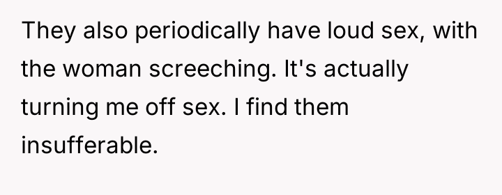Living next to neighbors who shatter the silence of the night with relentless noise, she endures the invasion of her peace and personal space. Despite her polite requests for quiet, their disregard deepens her frustration, turning what should be restful nights into a torment that even taints her own intimate moments. The relentless loudness is not just an annoyance—it’s a violation of her sanctuary.