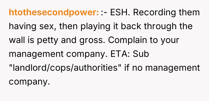Is the poster justified in considering recording intimate sounds for the purpose of petty revenge, or does this proposed action cross a critical ethical boundary, making them responsible for the resulting escalation? The debate hinges on whether the neighbors' extreme inconsideration nullifies the poster's obligation to use non-invasive conflict resolution methods.
