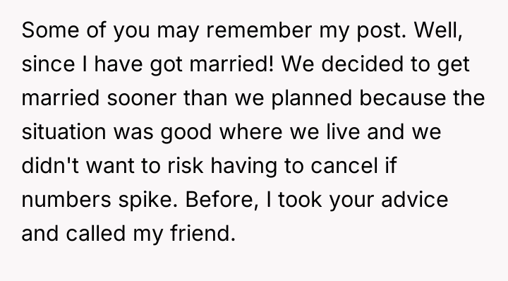 The original poster (OP) prioritized their health and wedding experience by establishing a firm boundary regarding their severe allergies, which conflicted directly with their friend's insistence on bringing a dog. Although the OP successfully navigated the wedding day happily, the initial friendship required a major shift, leading to the friend's absence and a current standoff where reconciliation depends on the friend initiating contact.