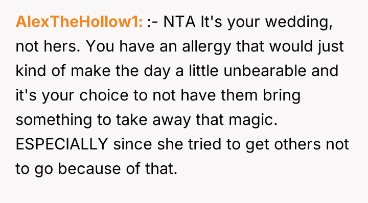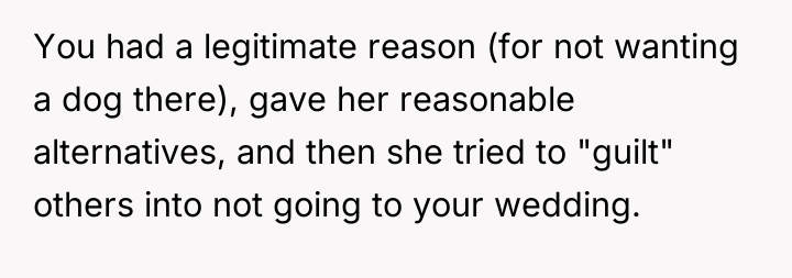 As renowned researcher Dr. Brené Brown explains, “Boundaries are the distance at which I can love you and me simultaneously.” The situation presented is a classic case study in boundary enforcement where one party's needs directly clash with another's demands. The OP recognized the severity of their allergies and communicated this boundary clearly after receiving prior advice. The friend, however, treated the dog's presence not as a request but as a fundamental condition for attendance, effectively refusing to engage in collaborative problem-solving. This rigidity suggests a potential prioritization of the friend's comfort or attachment to the pet over the OP's physical health and the significance of the wedding event itself. The OP's subsequent decision to proceed without the friend, while painful, was an appropriate defense of self-care when the other party refused to respect the established limits. The friend's attempt to rally mutual friends in solidarity further indicates a reaction based on entitlement or an inability to accept the boundary. Moving forward, the OP's stance that the friend must make the first move toward reconciliation is psychologically sound, as it places the responsibility for repairing the breach on the party who failed to respect the initial boundary. For future situations, the OP handled the communication about the boundary well, but they could perhaps preemptively suggest alternative ways to celebrate with the friend post-wedding (e.g., meeting in a neutral, pet-free environment) to show that the rejection was specific to the event, not the entire relationship, should they wish to soften the ensuing silence.