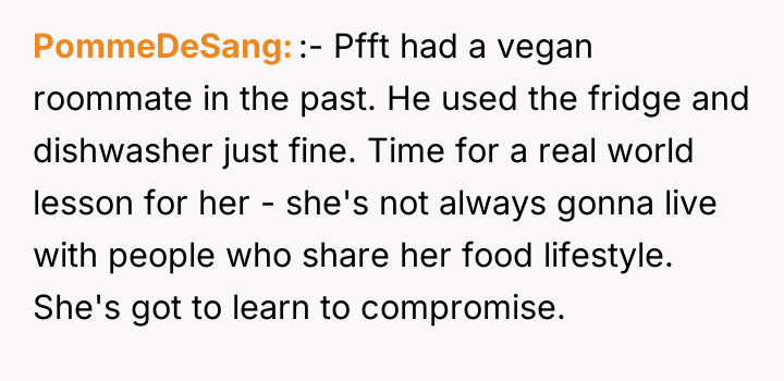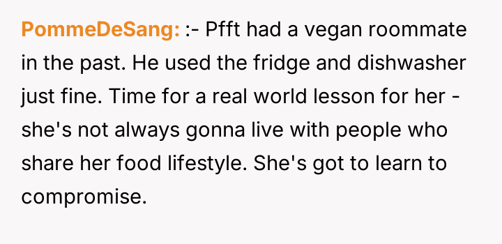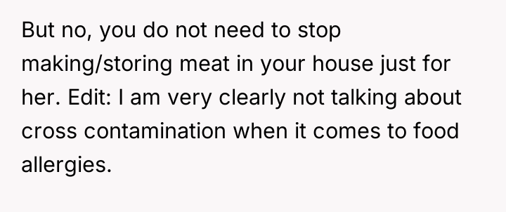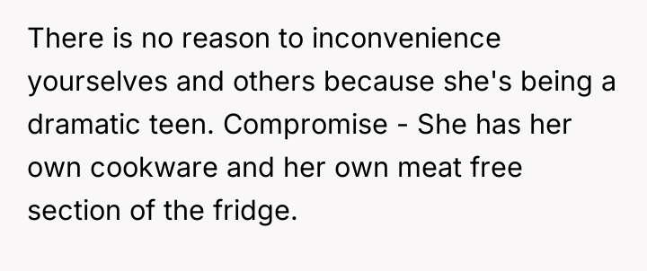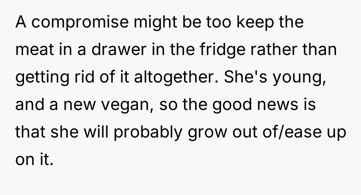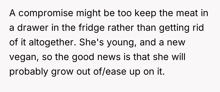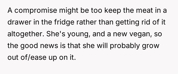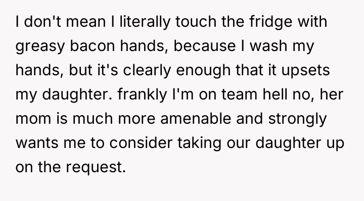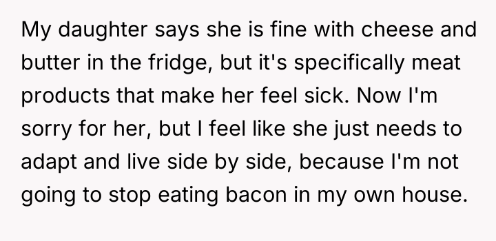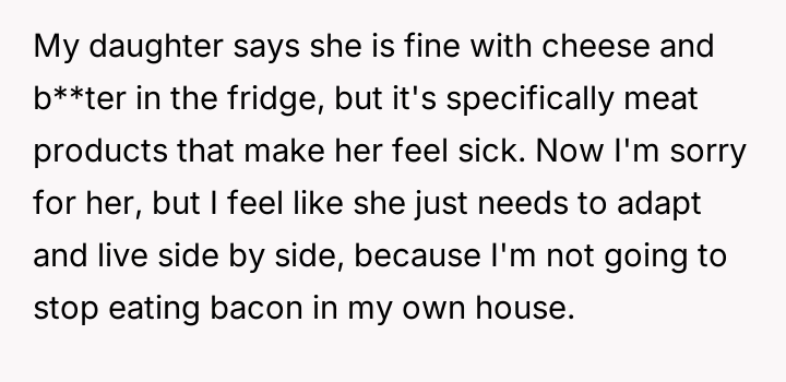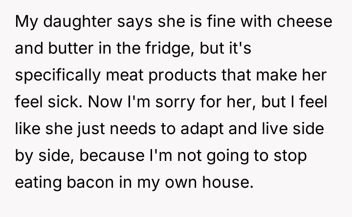 Should the father prioritize his daughter's deeply felt ethical need for a completely separate food space to avoid distress, even if it means significantly altering his own habits in his own home, or is the daughter's request an overreach, demanding that the majority adapt to the minority's lifestyle choices within a shared domestic environment?