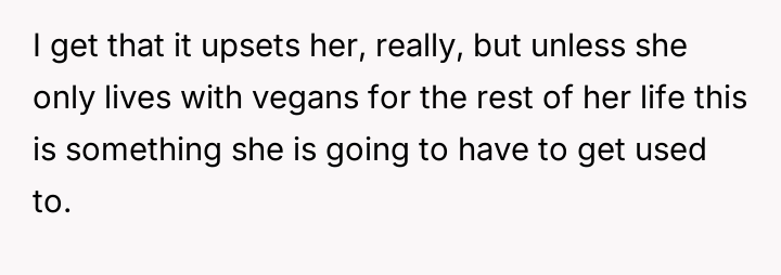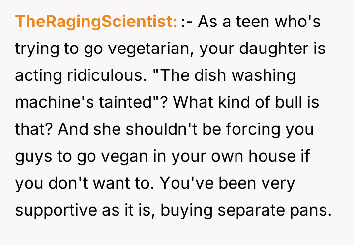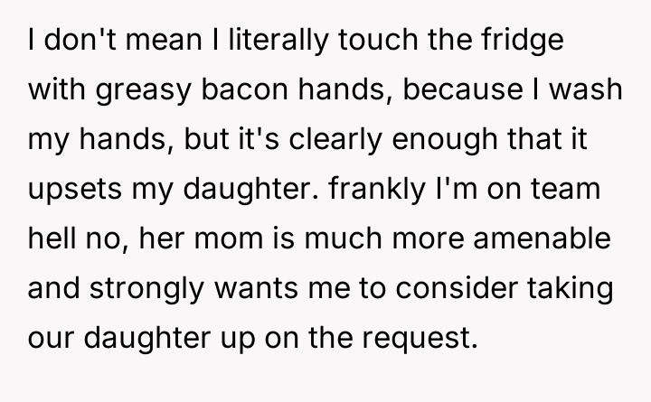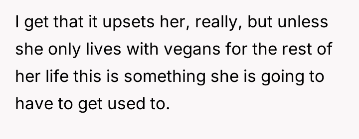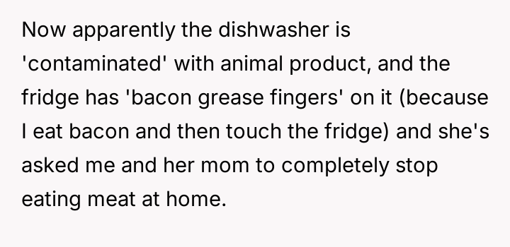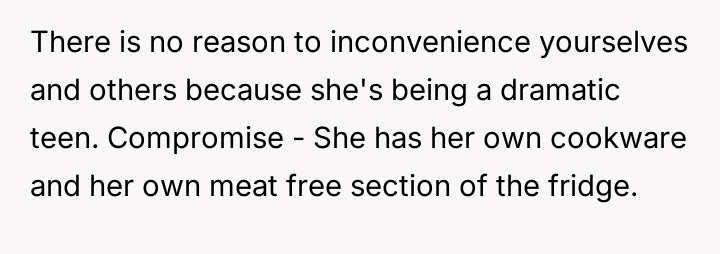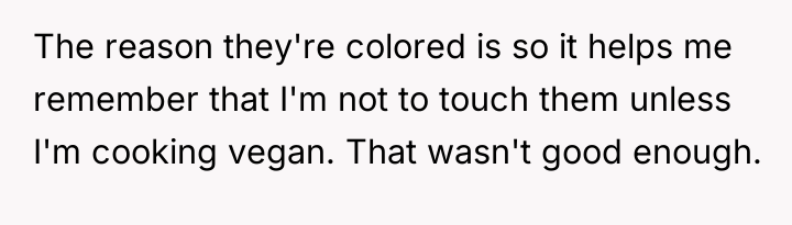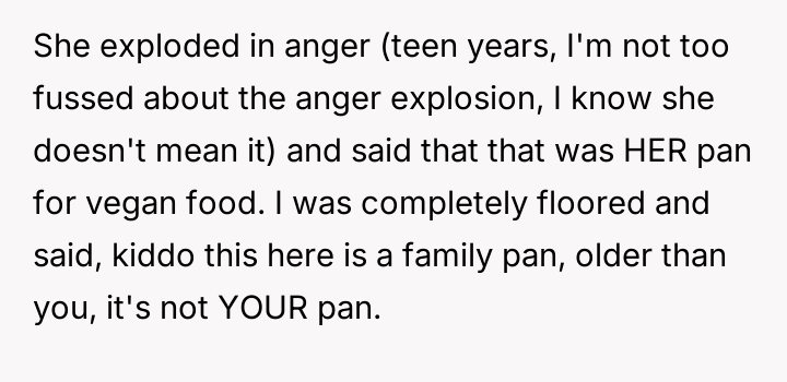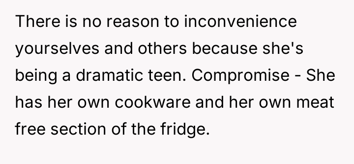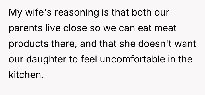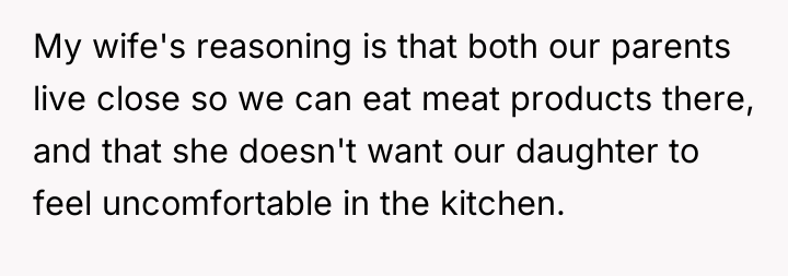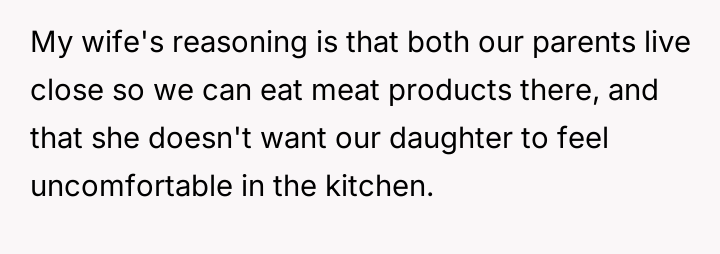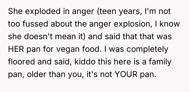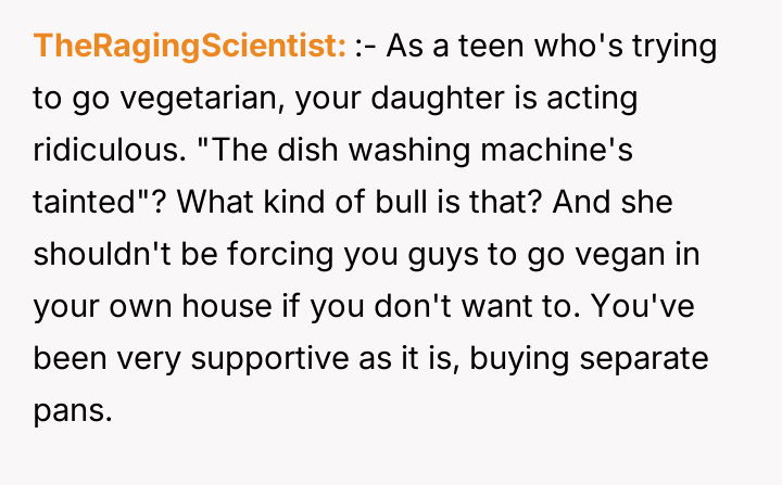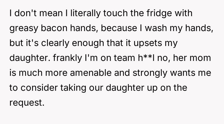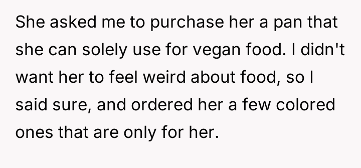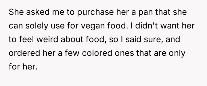 As renowned researcher Dr. Brené Brown explains, “Boundaries are the distance at which I can love you and me simultaneously.” This situation perfectly illustrates the tension that arises when deeply held personal values (the father's traditional diet) directly conflict with the expressed values of another family member (the daughter's veganism). The daughter is attempting to establish a clear boundary based on her moral framework, which she perceives as requiring physical separation of animal products to maintain her comfort and integrity. The core conflict here revolves around differing perceptions of contamination and control within a shared space. The father is focused on practical hygiene (washing hands) and the tradition of shared resources (family pan), viewing his daughter's requests as overly sensitive adaptations. Conversely, the daughter is operating from an emotional and ethical standpoint where mere proximity or trace amounts of animal products constitute a violation of her commitment. The wife's position introduces a mediator role, prioritizing immediate family harmony over the father's sense of fairness regarding shared space. The father's initial attempts to accommodate (buying a dedicated pan) were a good first step, but they failed to address the deeper issue of perceived cross-contamination in the larger kitchen environment (dishwasher, fridge surfaces). A constructive recommendation would be for the parents to collaboratively establish clear, scientifically reasonable, and emotionally respectful protocols for the kitchen. This might involve designating specific, small areas or containers for vegan storage, and agreeing on a communication plan rather than reacting defensively to boundary testing. The goal should be shared respect for different needs, not unilateral compliance.