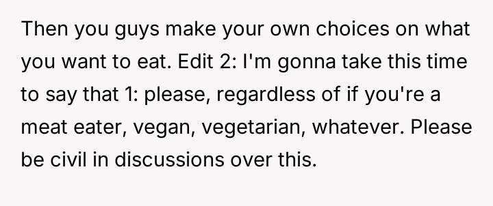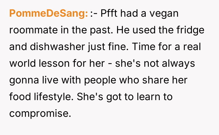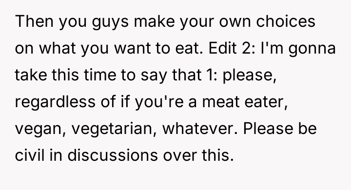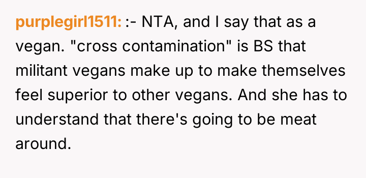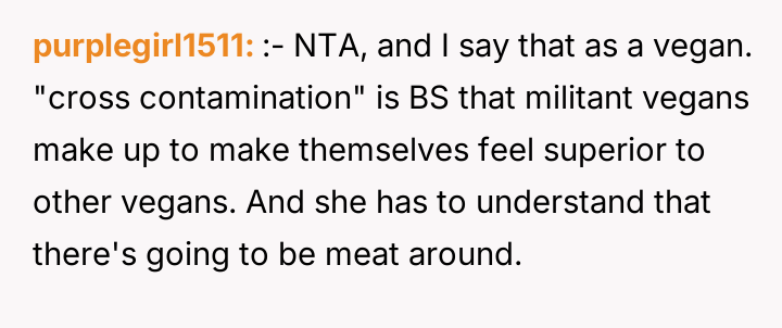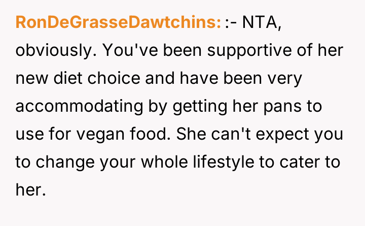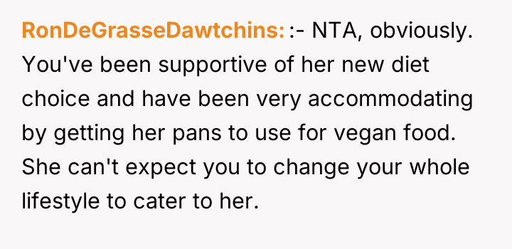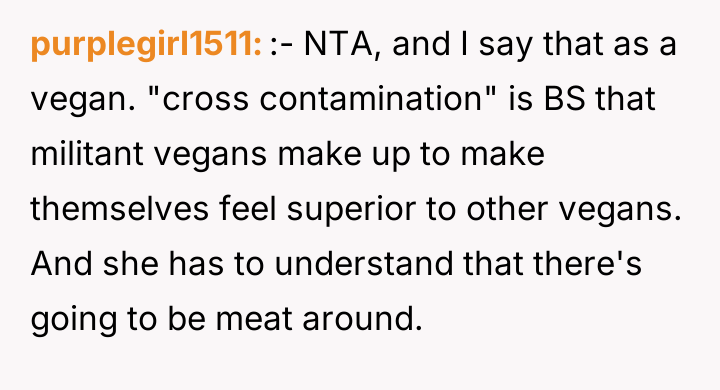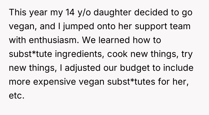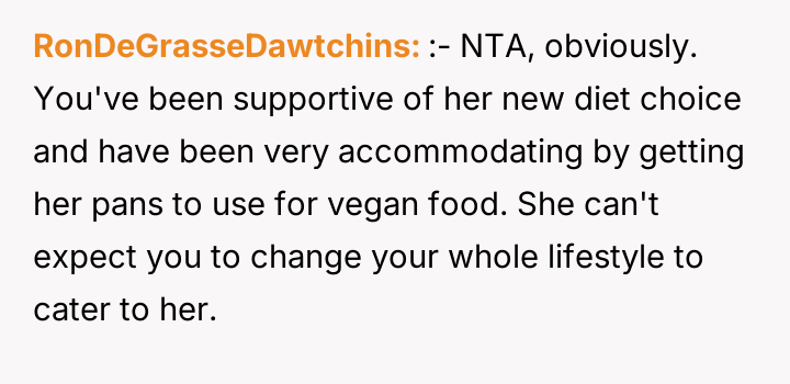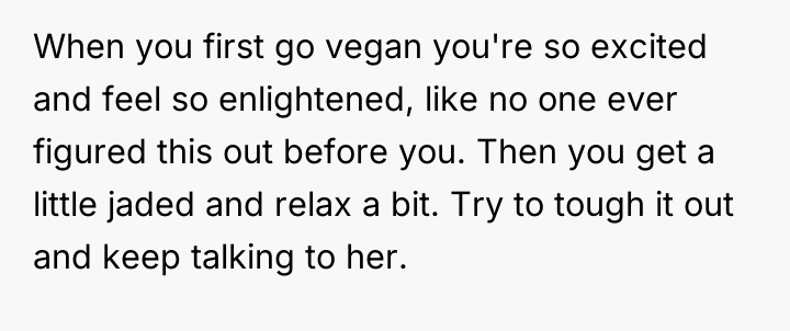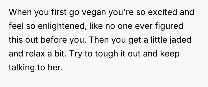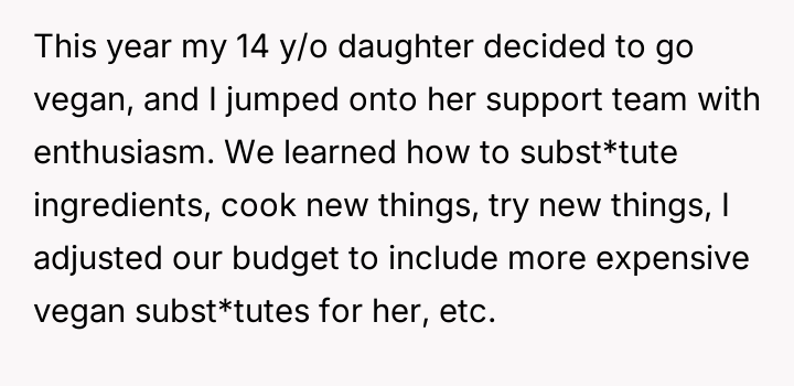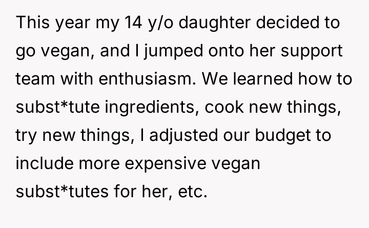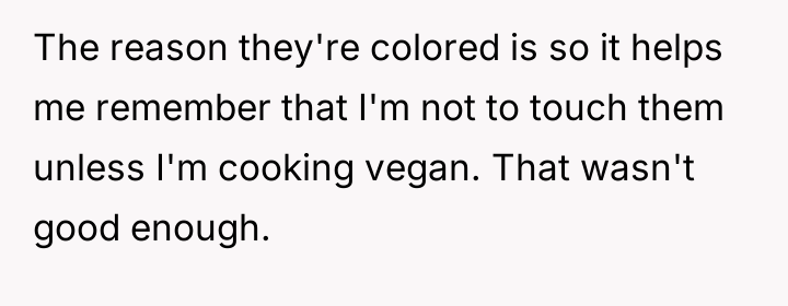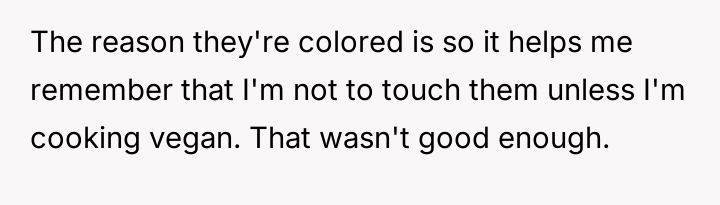 As renowned researcher Dr. Brené Brown explains, “Boundaries are the distance at which I can love you and me simultaneously.” This situation perfectly illustrates the tension that arises when deeply held personal values (the father's traditional diet) directly conflict with the expressed values of another family member (the daughter's veganism). The daughter is attempting to establish a clear boundary based on her moral framework, which she perceives as requiring physical separation of animal products to maintain her comfort and integrity. The core conflict here revolves around differing perceptions of contamination and control within a shared space. The father is focused on practical hygiene (washing hands) and the tradition of shared resources (family pan), viewing his daughter's requests as overly sensitive adaptations. Conversely, the daughter is operating from an emotional and ethical standpoint where mere proximity or trace amounts of animal products constitute a violation of her commitment. The wife's position introduces a mediator role, prioritizing immediate family harmony over the father's sense of fairness regarding shared space. The father's initial attempts to accommodate (buying a dedicated pan) were a good first step, but they failed to address the deeper issue of perceived cross-contamination in the larger kitchen environment (dishwasher, fridge surfaces). A constructive recommendation would be for the parents to collaboratively establish clear, scientifically reasonable, and emotionally respectful protocols for the kitchen. This might involve designating specific, small areas or containers for vegan storage, and agreeing on a communication plan rather than reacting defensively to boundary testing. The goal should be shared respect for different needs, not unilateral compliance.