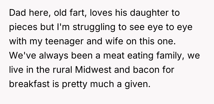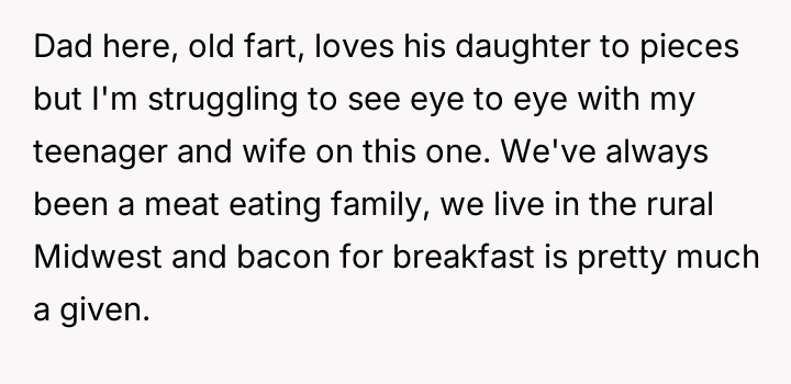 WIBTA for refusing to stop cooking bacon in my kitchen due to my teenage daughters vegan lifestyle?