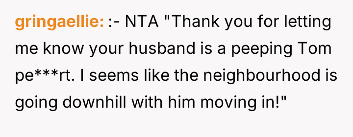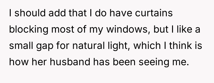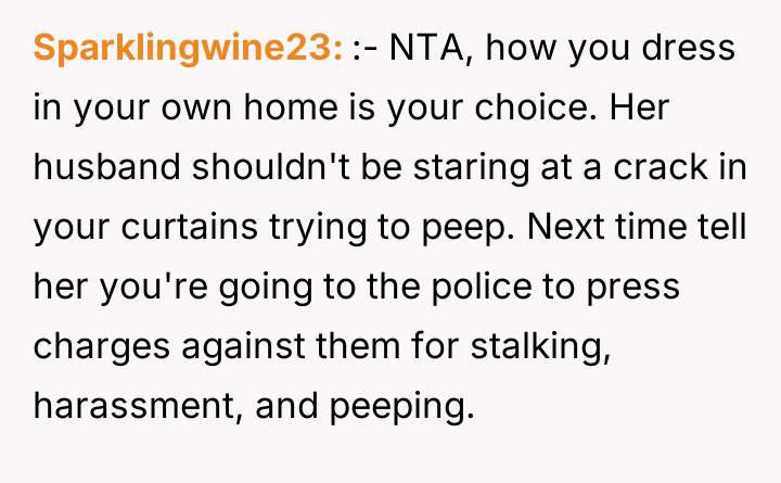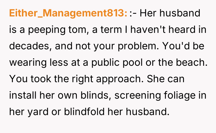 According to Dr. Drew Coleman, a specialist in boundary setting and interpersonal conflict, "Personal space and autonomy within one's dwelling are foundational rights, and external scrutiny of private attire, especially based on the gaze of a third party, represents a profound boundary violation by the observer, not the observed." The core issue here is misplaced responsibility. The neighbor is attempting to impose social control over the OP's private conduct based on her husband's inappropriate gazing. The OP's clothing choice, while visible due to a small gap in the curtains, occurred within the OP's private residence, which legally and ethically establishes the husband's viewing as the primary inappropriate action. By suggesting the OP 'check her husband,' the OP correctly identified the locus of the problem. Professionally, the OP acted appropriately by defending their boundaries and pointing out the husband's behavior. The best path forward involves immediate, complete closure of the visual access (e.g., using blinds or curtains) to eliminate any future possibility of observation, thereby removing the neighbor's stated grounds for complaint, while continuing to assert that their attire inside their home is non-negotiable.