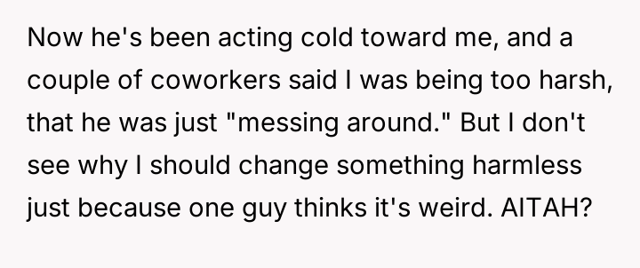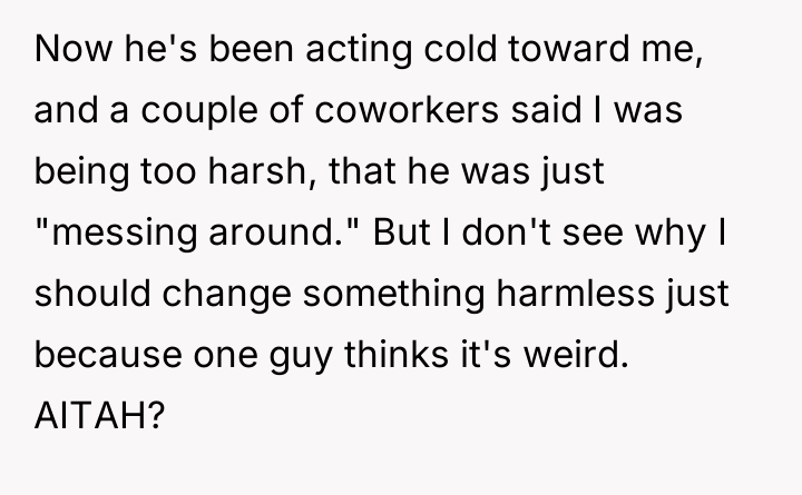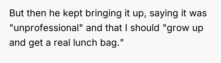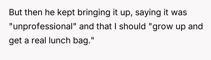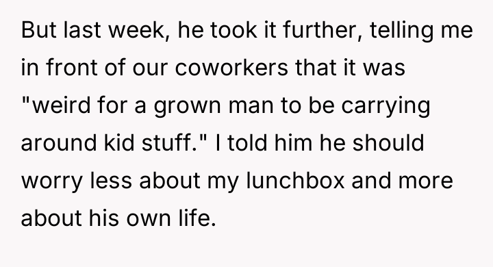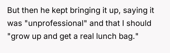 According to Dr. Quinn Washington, a specialist in workplace dynamics, 'Boundaries are often tested not by the initial transgression, but by the consistency of the reaction to pushback. When a boundary is clear, the issue shifts from the boundary itself to the insistence on violating it.' The OP established a clear, low-stakes personal boundary by continuing to use his lunchbox despite initial teasing. His choice of container is a matter of personal preference and utility, having no bearing on his professional responsibilities. Matt's behavior escalated from light joking to public shaming, suggesting his motive was not concern over professionalism but an attempt to enforce conformity or assert social dominance. The reaction from other coworkers suggests a general discomfort with open conflict, leading them to label the OP as 'too harsh' for resisting what they perceive as harmless teasing. The OP's final confrontation, while emotionally charged, was a direct defense of his autonomy against persistent social pressure. In professional settings, resisting unwarranted scrutiny is necessary, though the delivery can always be refined. The suggested path forward is for the OP to maintain the use of his lunchbox if he prefers it, but to address future unsolicited comments by firmly stating, 'This is settled; I will not discuss my lunch container again,' thereby closing the topic definitively without engaging in further argument.