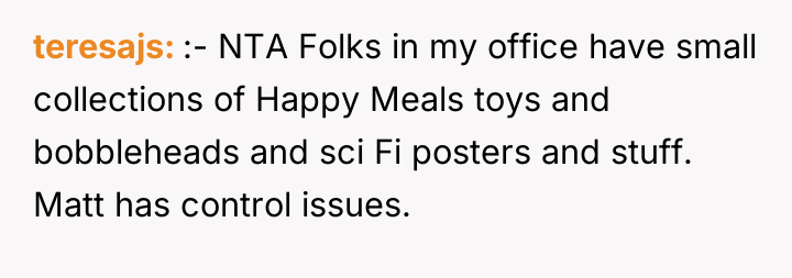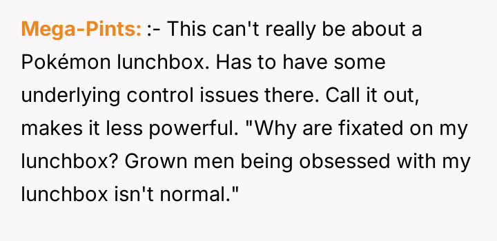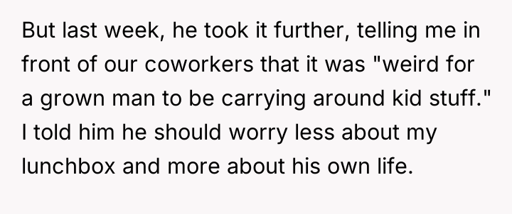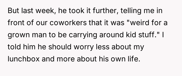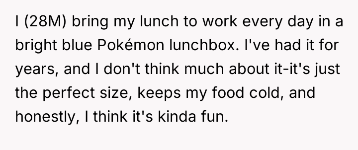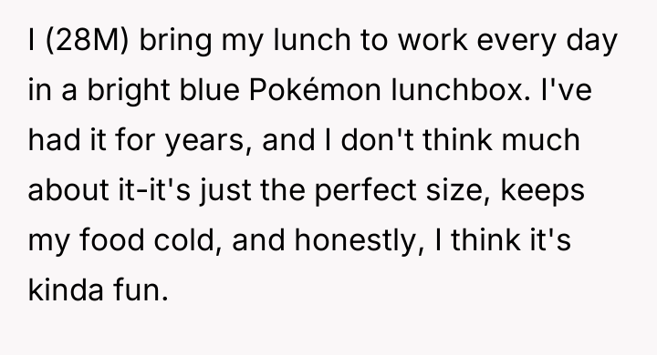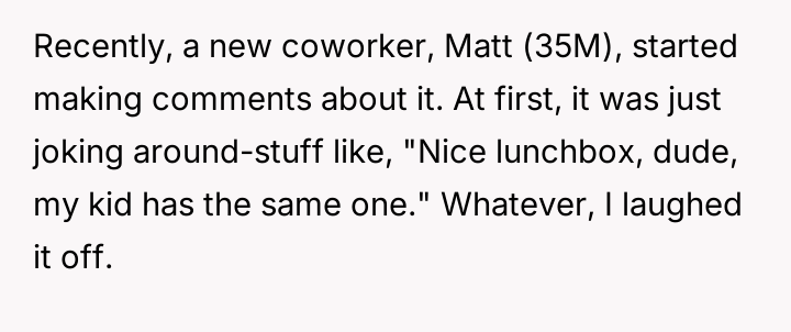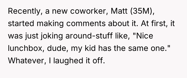 A new coworker, Matt (35M), began repeatedly criticizing the lunchbox, calling it unprofessional and suggesting the OP needed to 'grow up.' When the OP defended his choice, Matt escalated the criticism publicly, leading to tension between the two men and mixed reactions from other colleagues. The OP is now facing a dilemma: should he change his harmless personal item because of one coworker's disapproval?