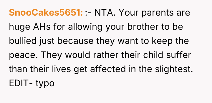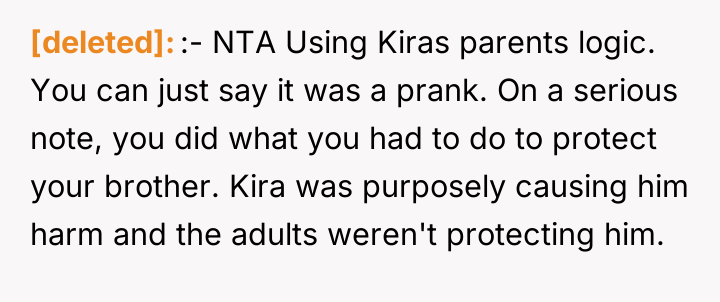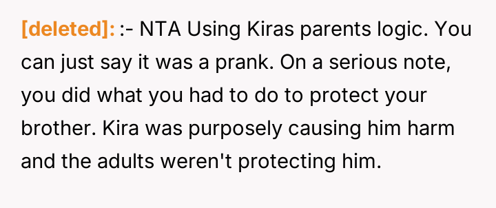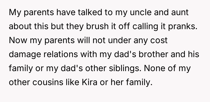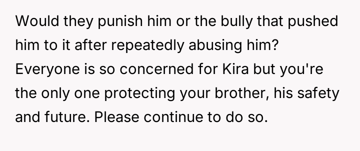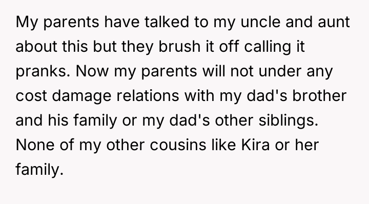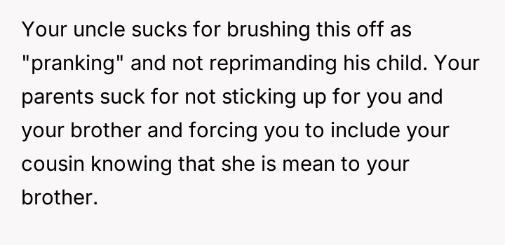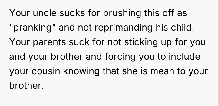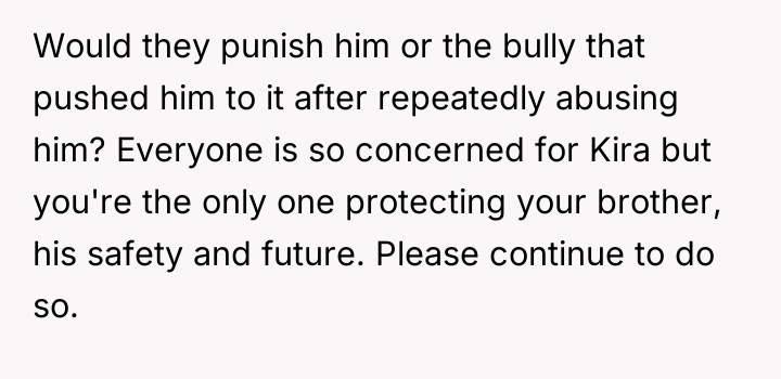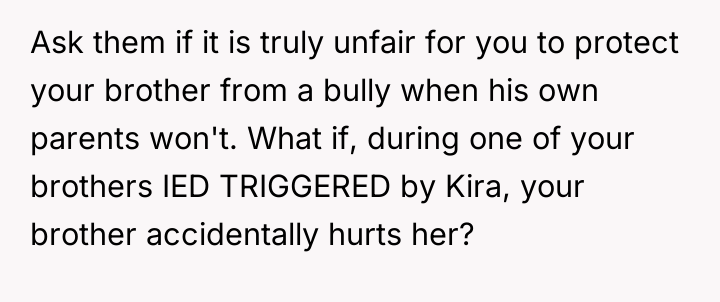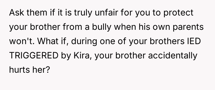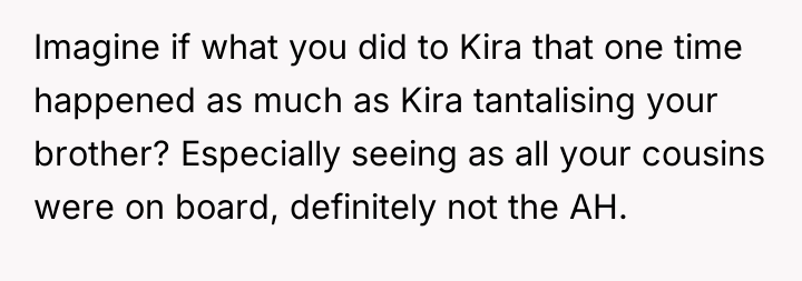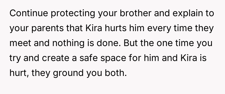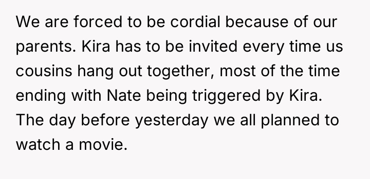 The original poster (OP) acted to protect their brother, Nate, from known emotional provocation by their cousin, Kira, resulting in the OP and Nate being punished by their parents. The central conflict involves the OP's attempt to set a boundary for Nate's emotional well-being against their parents' desire to maintain peace with the extended family, despite Kira's ongoing harmful behavior.