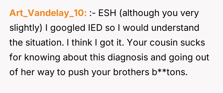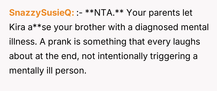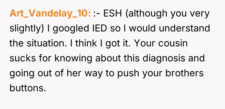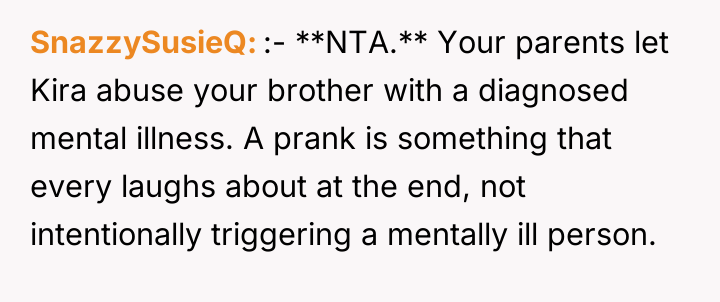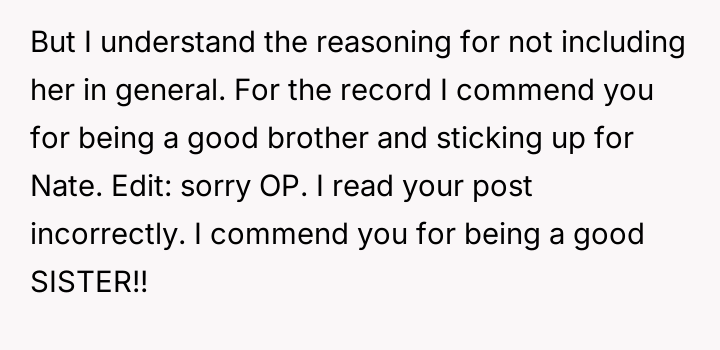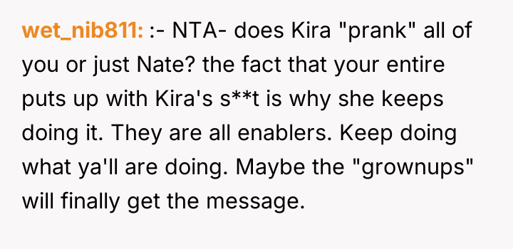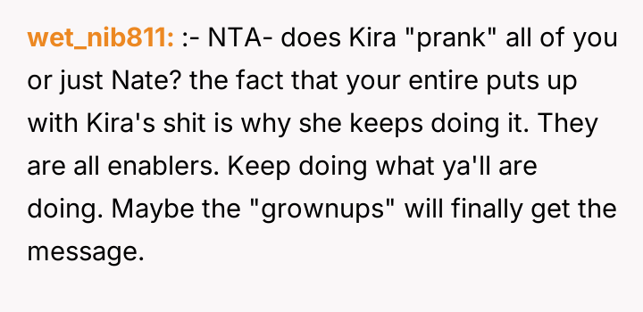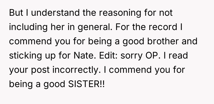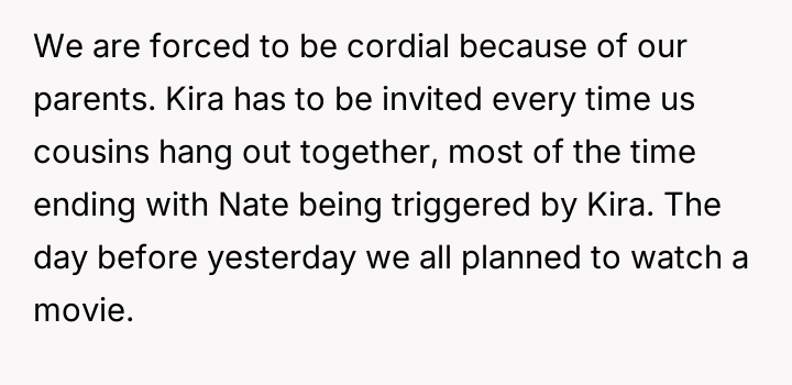 As renowned family therapist Dr. Nedra Glover Tawwab explains, “Boundaries are about what is okay and not okay for you, and communicating that to others.” In this situation, the OP recognized that Kira consistently violated Nate’s emotional space, which is a form of aggression given his Intermittent Explosive Disorder (IED). The parents' refusal to address Kira's behavior forces the OP and Nate into a position where they must create their own, albeit indirect, boundary. The OP’s motivation appears rooted in protection and loyalty toward Nate, especially since the parents failed to intervene effectively. Giving the wrong time was a direct intervention designed to prevent Nate from being triggered, which aligns with prioritizing his known vulnerability. However, the execution—leaving Kira waiting and causing her distress—was an aggressive, albeit coordinated, response that escalated the conflict rather than diffusing it long-term. This action, while perhaps understandable given the circumstances, bypasses mature communication and forces the consequence onto Kira. The OP’s action was an understandable, but ultimately immature, defensive maneuver. A more constructive approach would involve clear, firm communication directed at the parents about the necessity of enforcing boundaries on Kira, perhaps by stating that Nate cannot attend gatherings where Kira is present unless her provocative behavior ceases. If the parents refuse to act, the OP should limit Nate’s exposure to Kira rather than resorting to trickery, which damages trust within the immediate family unit.