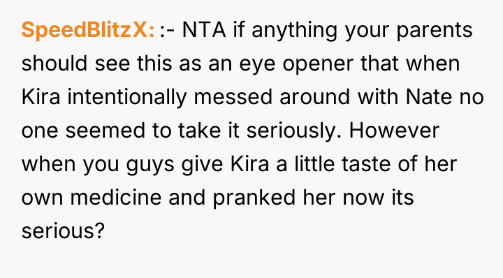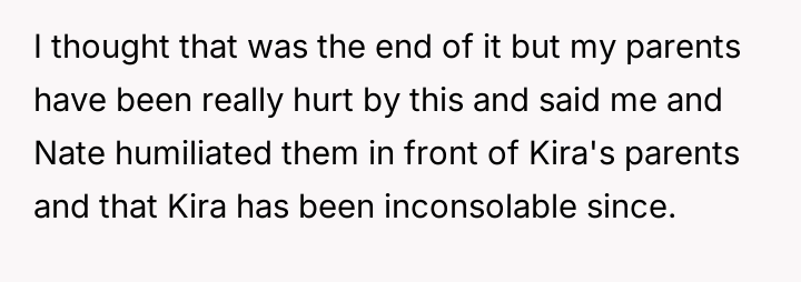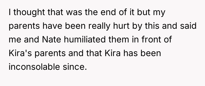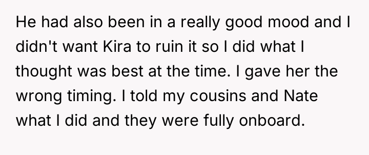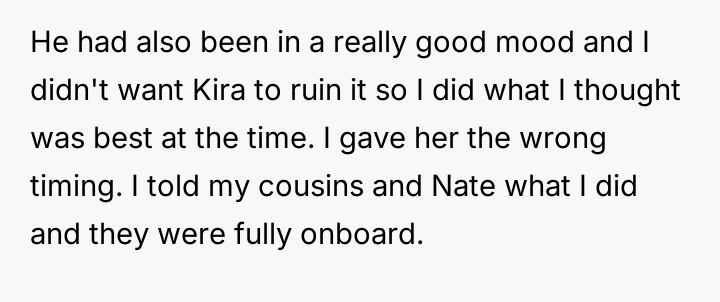 Was the OP justified in deceiving Kira to prevent a conflict that would harm their brother, or did this action cross a line by deliberately humiliating a family member and causing distress to their parents? Should the focus remain on protecting Nate's mental health, or on upholding family unity and honesty?