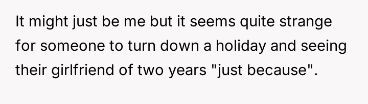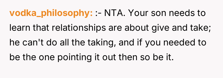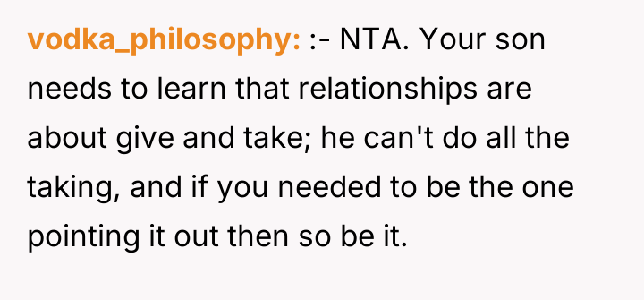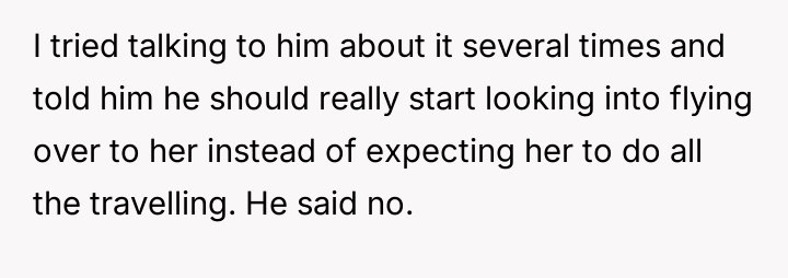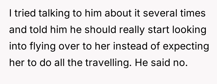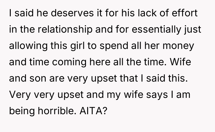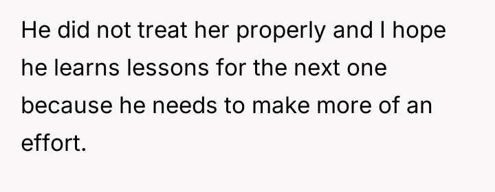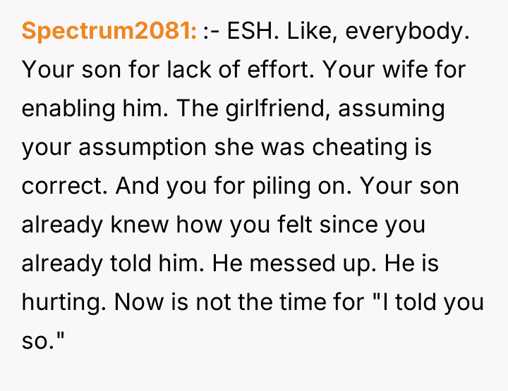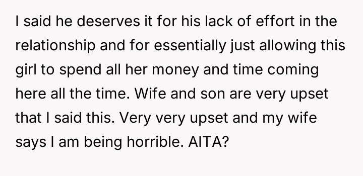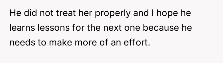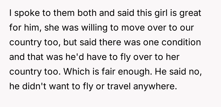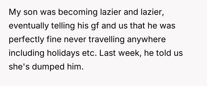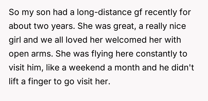 As renowned researcher Dr. Brené Brown explains, “Boundaries are the distance at which I can love you and me simultaneously.” This situation highlights a significant failure in boundary setting and reciprocity within the relationship dynamic. The girlfriend invested heavily—financially, emotionally, and through travel—while the son exhibited extreme inertia, prioritizing comfort over partnership. The son's refusal to meet the basic expectation of reciprocating travel, even when the relationship's future depended on it, signaled a fundamental lack of commitment or respect for his partner's efforts. The mother's fear, which seemed to enable the son's passivity, further complicated the dynamic by removing external accountability. The OP's motivation appears to be a desire to teach a harsh but necessary lesson about relationship equity, viewing the breakup as a natural consequence. While the OP's assessment of the son's deficient effort is likely accurate from an objective standpoint, expressing this judgment so confrontationally to both his son and wife, particularly right after the breakup, was counterproductive and damaging to immediate family relationships. A more constructive recommendation would have been to address the pattern of laziness privately with the son first, focusing on future behavior rather than simply validating the ex-girlfriend's decision in the immediate aftermath of the pain.