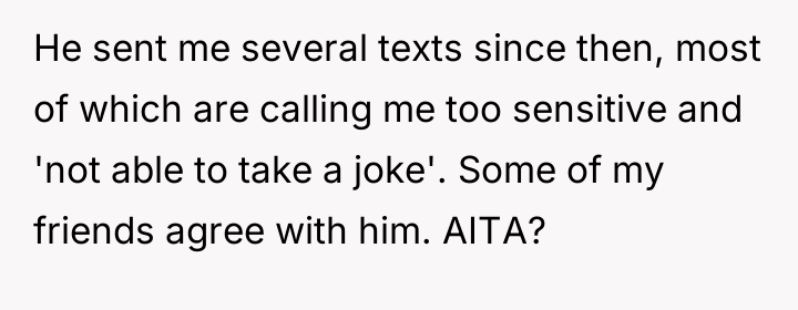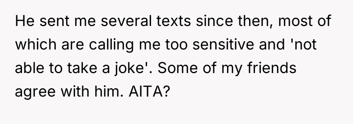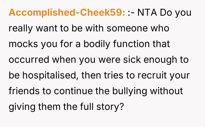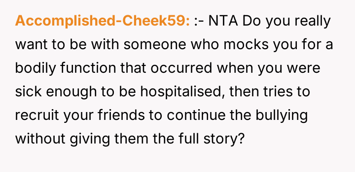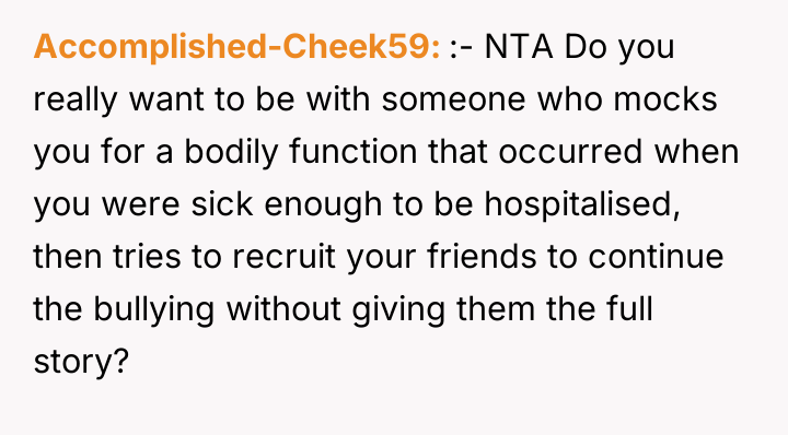 Considering the clear boundary violation and lack of respect shown by the boyfriend—especially in a sensitive health situation—the question remains: When a partner publicly humiliates another for a medical accident and then labels their distress as being 'too sensitive,' does this behavior constitute a fundamental breach of trust that justifies ending the relationship?