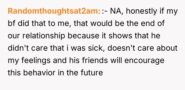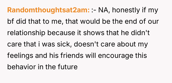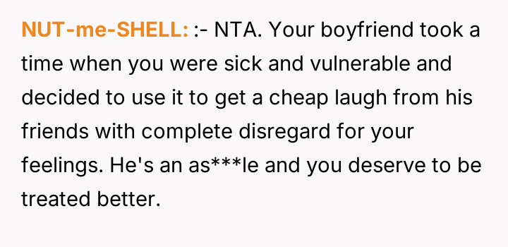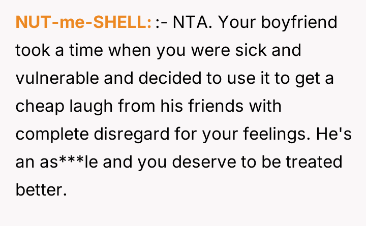 The original poster (OP) is dealing with the emotional fallout of a deeply embarrassing incident, which was amplified when her boyfriend chose public ridicule over privacy and support. The central conflict lies between the OP's need for empathy and discretion regarding her illness and her boyfriend's reaction, which prioritized making a joke at her expense and dismissing her valid feelings of humiliation.