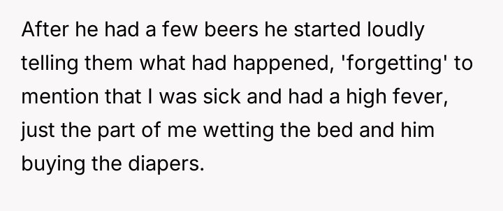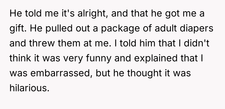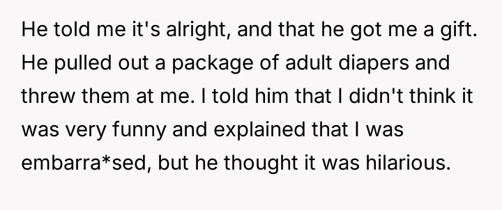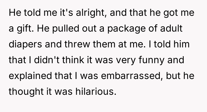As renowned researcher Dr. Brené Brown explains, “Boundaries are the distance at which I can love you and me simultaneously.” This situation highlights a severe failure in establishing and respecting relational boundaries, specifically around vulnerability and privacy. The boyfriend crossed a significant line not only by gifting adult diapers after a bed-wetting incident caused by a high fever but, more critically, by weaponizing the story for entertainment among friends. The boyfriend’s actions—throwing the diapers, laughing off the OP's embarrassment, and then publicly broadcasting the story while omitting the context of illness—demonstrate a lack of empathy and an unhealthy power dynamic where his desire for humor overrides his partner's emotional safety. Labeling the OP as "too sensitive" is a common gaslighting tactic used to deflect responsibility for hurtful behavior. In a healthy partnership, vulnerability, especially during illness, should be met with care, not public mockery. The OP’s decision to leave the social gathering was an appropriate self-preservation response to an emotionally unsafe environment. For future similar situations, the constructive recommendation is for the OP to clearly state non-negotiable boundaries regarding privacy and respect immediately after the incident. If these core boundaries continue to be violated, reevaluating the long-term viability of a relationship lacking fundamental respect is necessary.