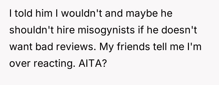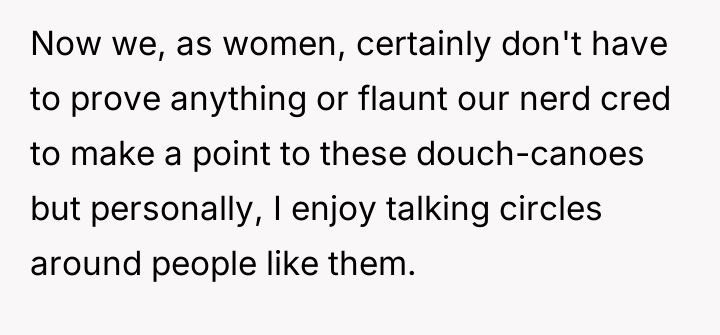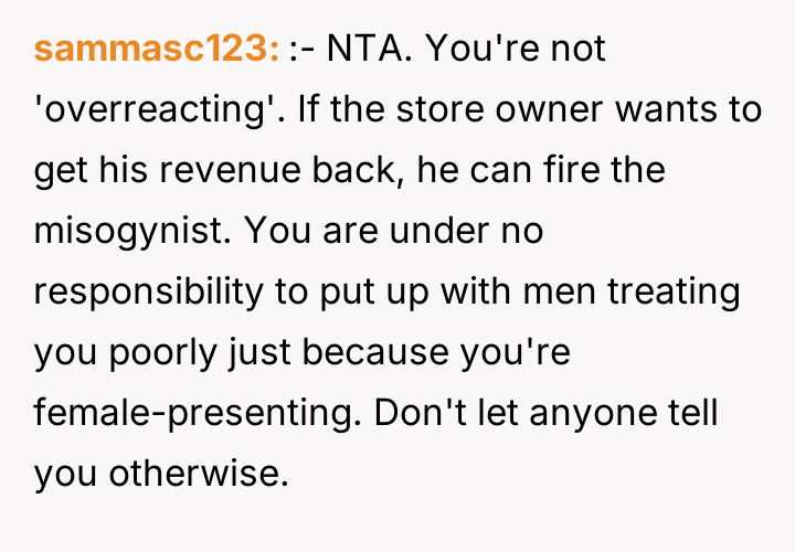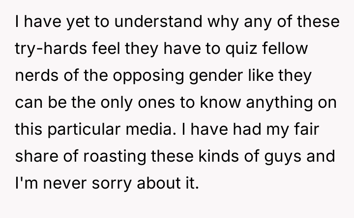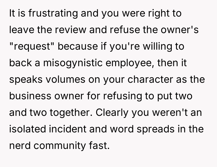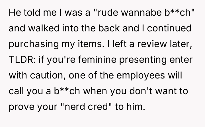As renowned researcher Dr. Brené Brown explains, “Boundaries are the distance at which I can love you and me simultaneously.” In this situation, the OP attempted to set a boundary when the employee initiated an inappropriate quiz about her knowledge and then escalated by using abusive language. The employee, motivated by gatekeeping behavior common in certain fandoms, violated this boundary by refusing to accept the OP's competence based on her presentation. The OP's reaction—standing her ground, dismissing the employee, and later leaving a detailed public review—was a strong assertion of self-respect against harassment and misogyny. While her friends may perceive her reaction as overreacting, her experience involved verbal abuse in a commercial setting. The owner's subsequent actions prioritized damage control over acknowledging the harm done to the customer, further validating the OP's decision to publicize the event. The OP's action of leaving the review was appropriate in holding the business accountable for its staff's conduct, especially since the owner confirmed other complaints existed. Moving forward, while direct confrontation is sometimes necessary, a constructive recommendation for similar scenarios would be to immediately request to speak with the manager or owner on-site, documenting the incident, before resorting to public reviews, though the OP's final action remains defensible given the severity of the language used.