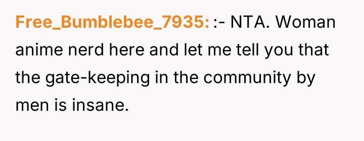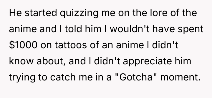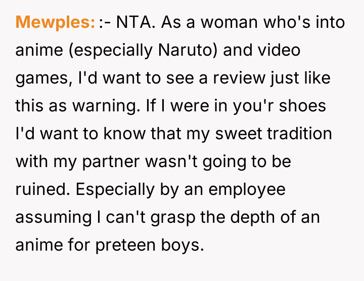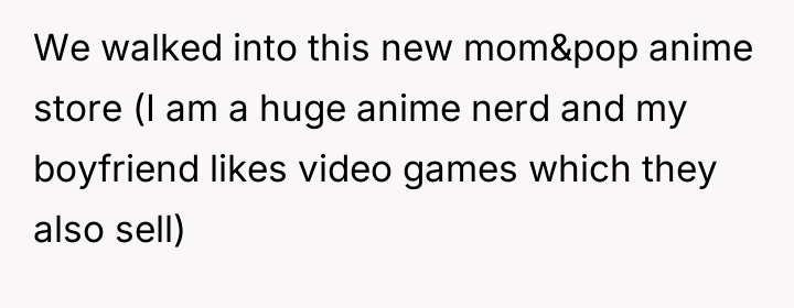 The original poster (OP) faced a confrontation where an employee challenged her knowledge of anime, leading to offensive language from the employee and a subsequent negative review. The central conflict lies between the OP's right to enjoy her hobbies without being tested and the store owner's desire to protect his business reputation and revenue.