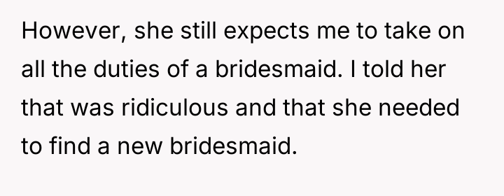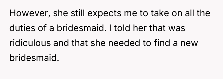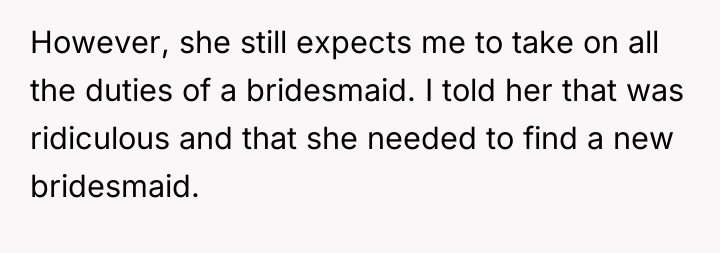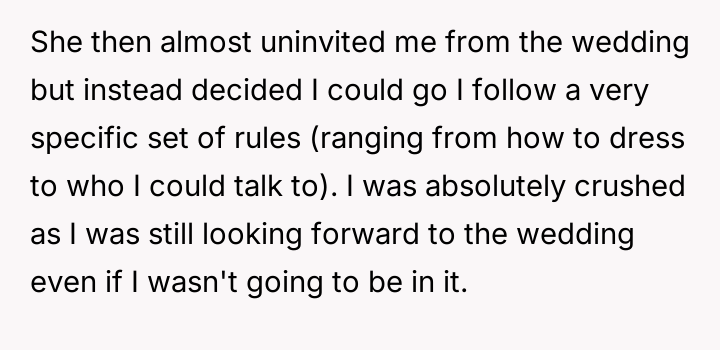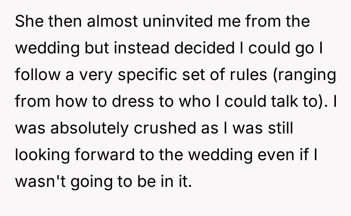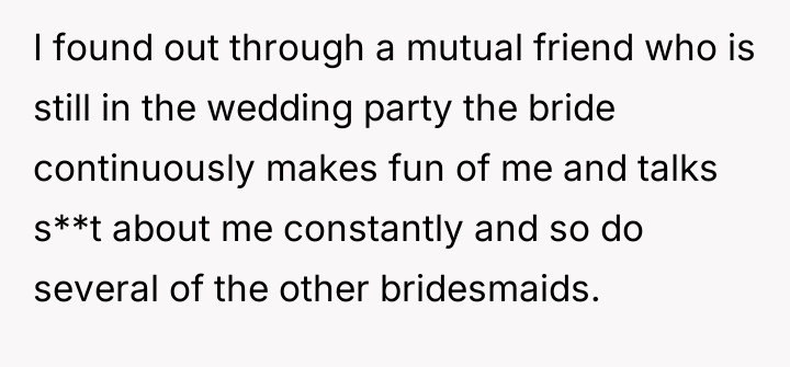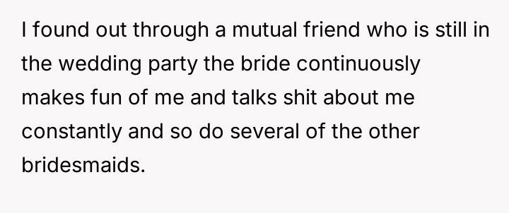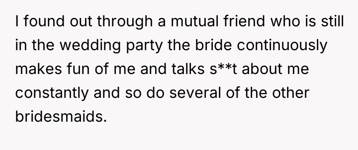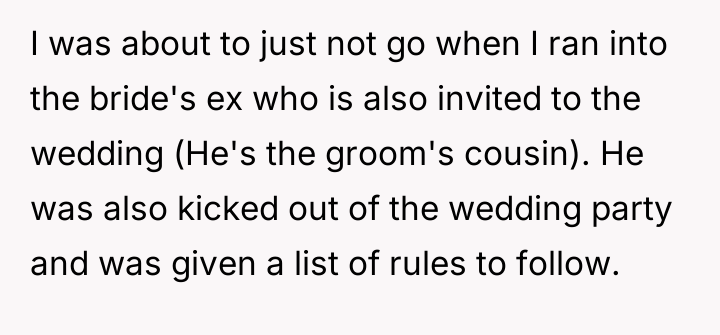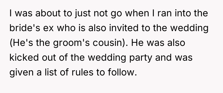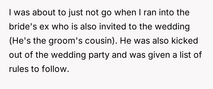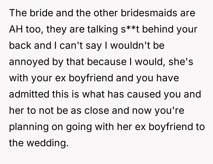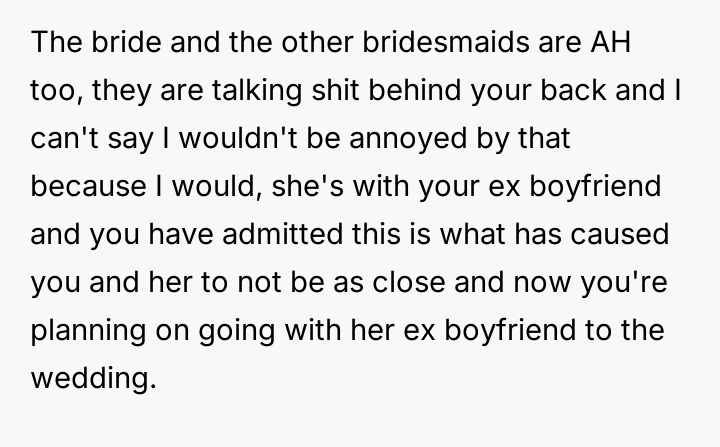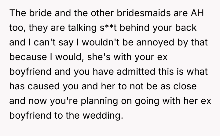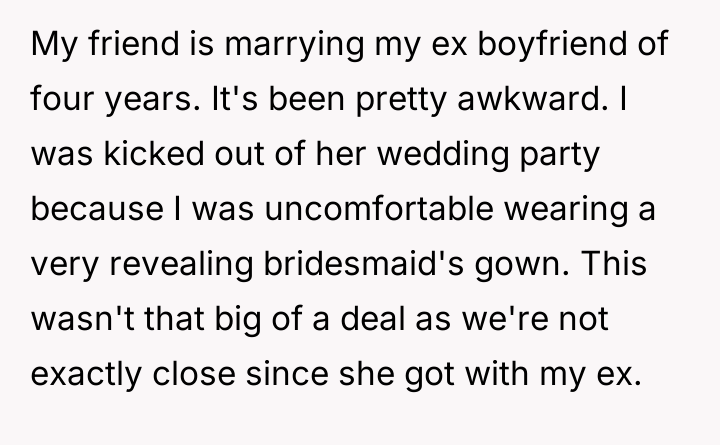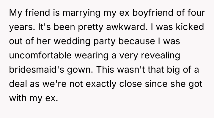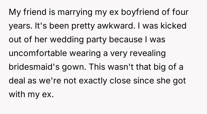 The original poster (OP) finds herself in a deeply uncomfortable position, navigating a friend's wedding to her ex-boyfriend while facing escalating mistreatment from the bride, including being removed from the wedding party and subjected to petty behavioral restrictions.