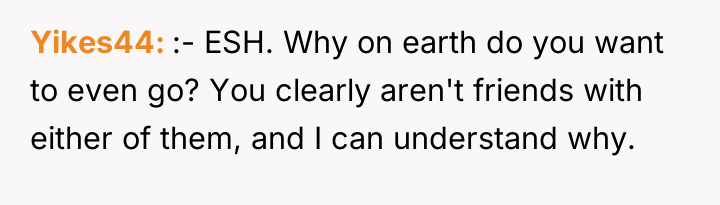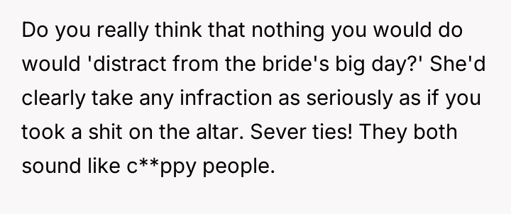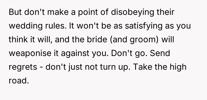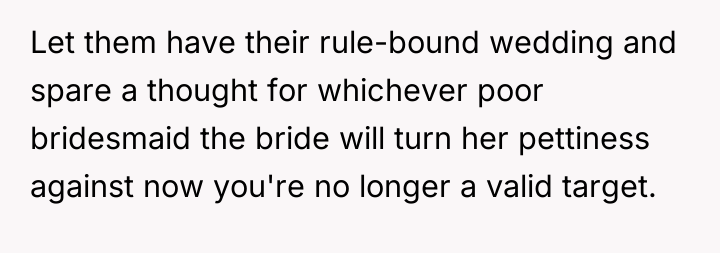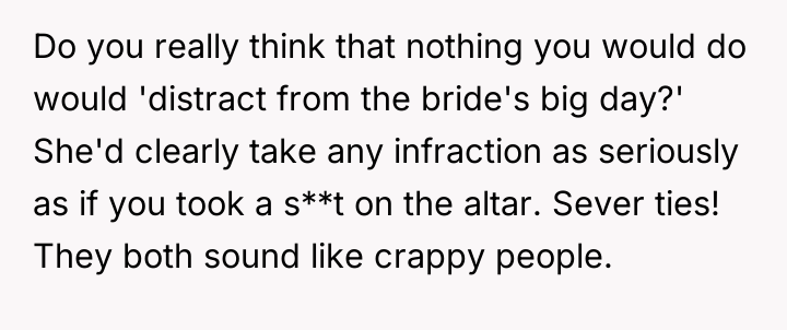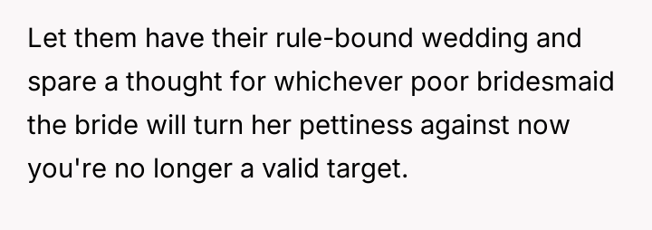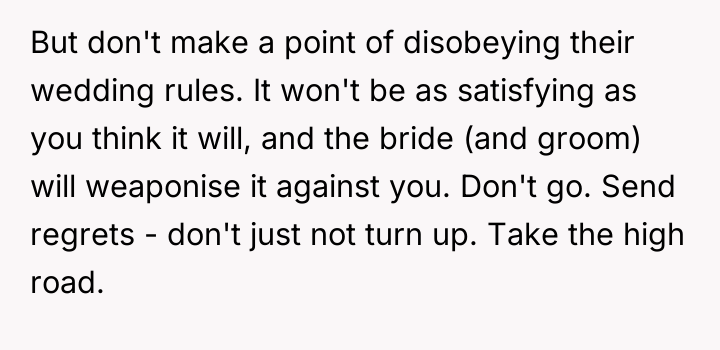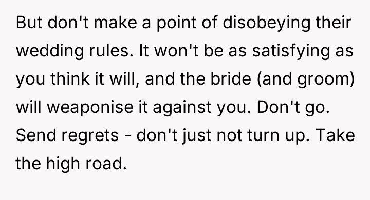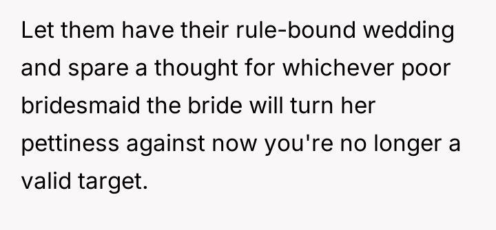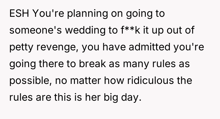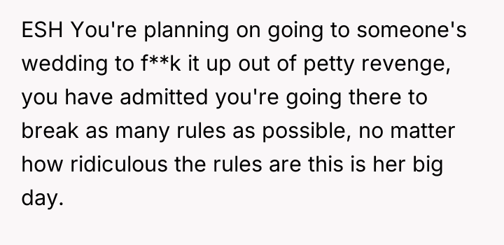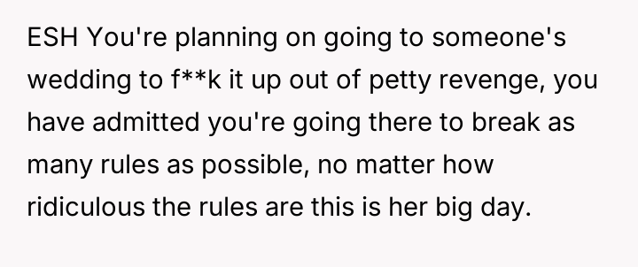 As renowned social psychologist Dr. Harriet Lerner explains, “When we give up our right to say no, we give up our right to say yes.” This situation reflects a severe breakdown in relational boundaries where the bride has weaponized her wedding status to exert control and inflict emotional distress on the OP, stemming from unresolved feelings related to the past relationship. The bride’s actions—demanding bridesmaid duties after removing the OP from the party, imposing arbitrary dress codes, and then explicitly mocking the OP with others—demonstrate a pattern of passive-aggressive control and boundary violation. The OP's initial attempt to manage discomfort by stepping down was met with further punitive measures. Her subsequent decision, shared with the groom's cousin who experienced similar exclusion, shifts the dynamic from victimhood to active agency. Their plan to attend and intentionally subvert the petty rules is a form of protest against emotional manipulation, prioritizing self-respect over forced compliance. The OP’s actions, while potentially creating drama at the event, are an understandable response to being publicly disrespected and marginalized. A more constructive approach in the future would involve clear, assertive communication about the need to end the friendship before the event, rather than waiting for the bride to dictate terms. However, in this immediate context, prioritizing their own emotional well-being by establishing a firm, shared boundary against mistreatment (even through rule-breaking) is defensible.