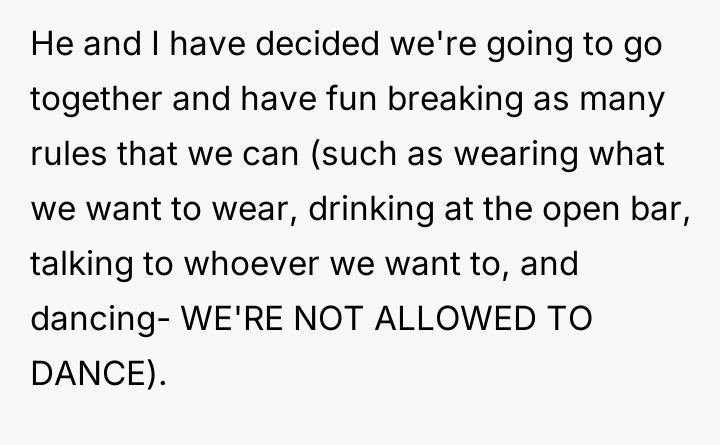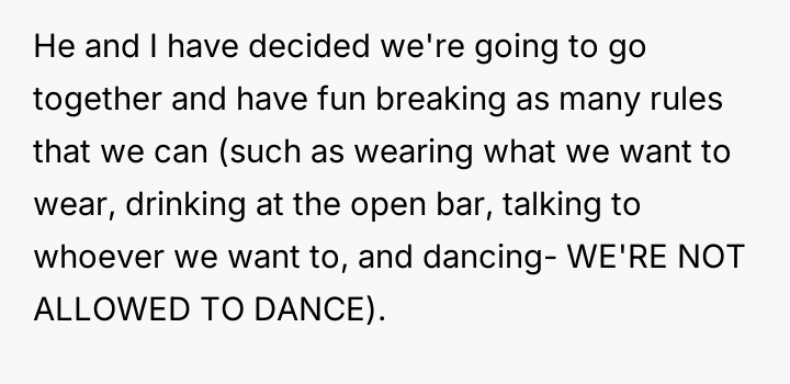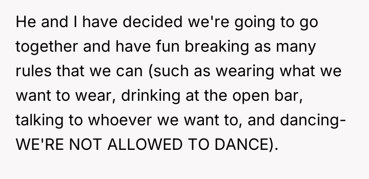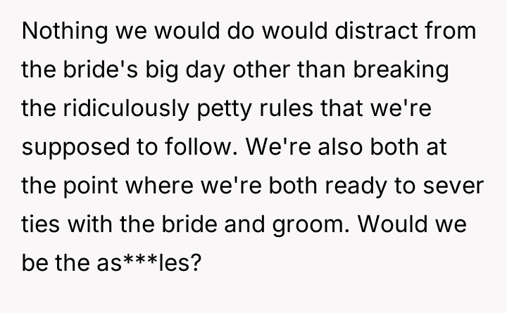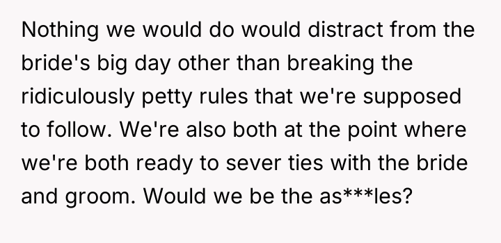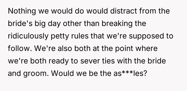 Given the OP's decision to attend with another similarly alienated guest and intentionally violate the imposed rules, the core question remains: Are the OP and her companion acting as justified individuals defending their dignity, or are they behaving inappropriately by choosing confrontation over quiet respect for the wedding event?