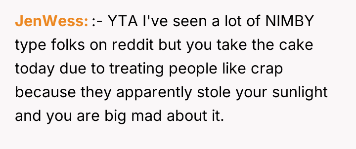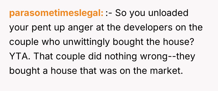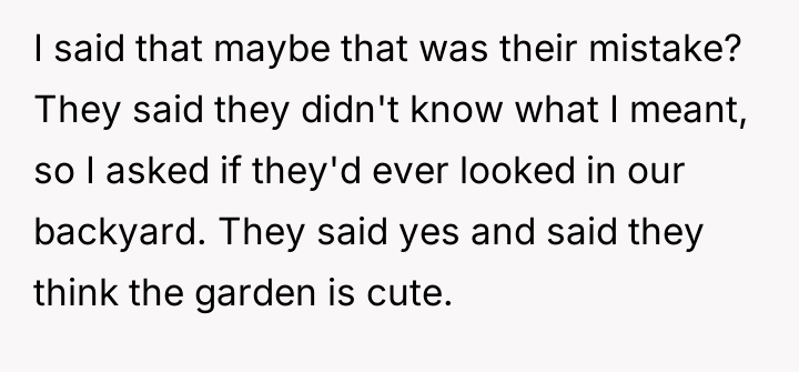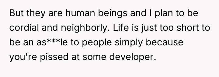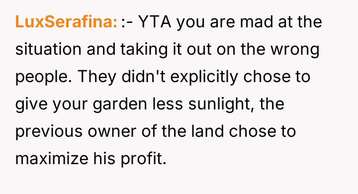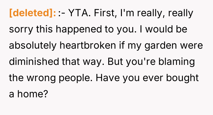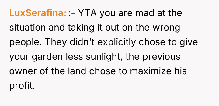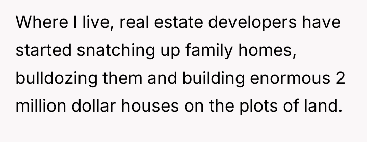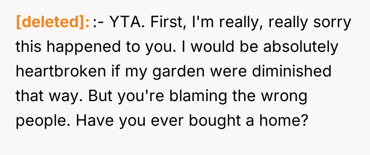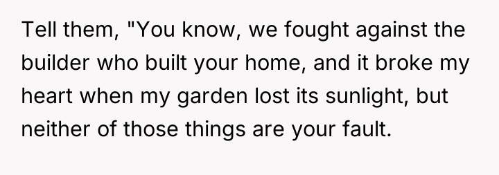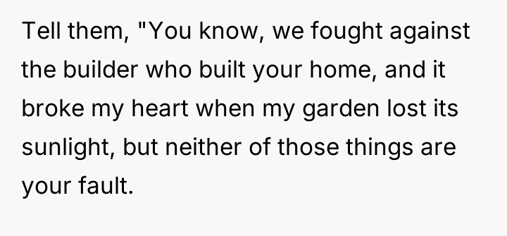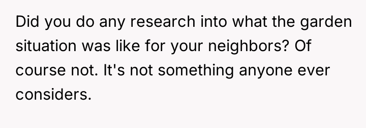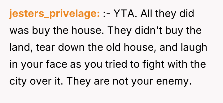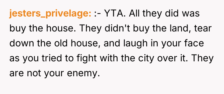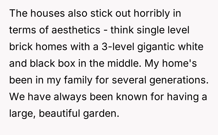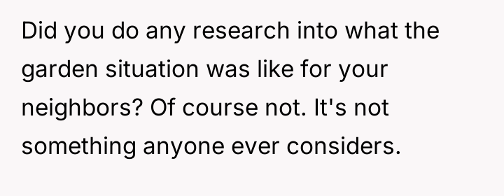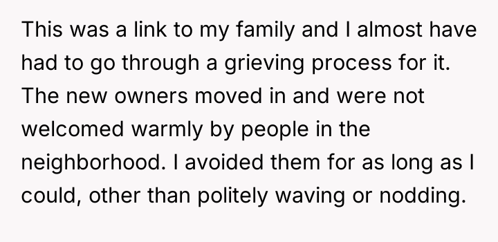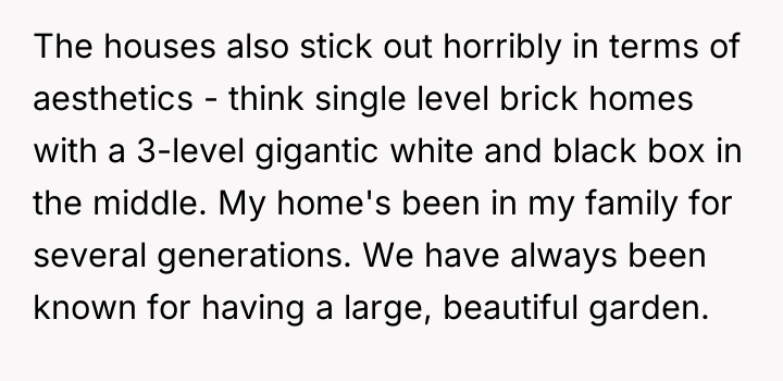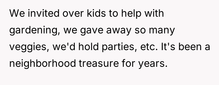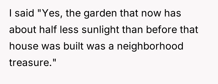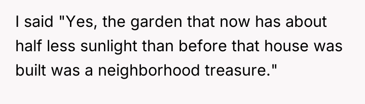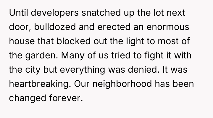 As renowned researcher Dr. Brené Brown explains, “Boundaries are the distance at which I can love you and me simultaneously.” In this scenario, the OP and the neighbors are operating without established, healthy boundaries regarding shared space and community expectations. The developers acted legally, but their action caused a significant intrusion into the OP's emotional landscape, which is a violation of their sense of place and history. The new neighbors, being young and new to the area, demonstrated a significant lack of due diligence, moving from a different state and seemingly operating under the assumption that high monetary value automatically translates to social capital and community welcome. Their surprise at the cold reception is understandable from a transactional viewpoint, but ignores the context of neighborhood sentiment. The OP's response, while emotionally cathartic for them, was highly confrontational and lacked constructive boundary setting; it served as an aggressive, albeit truthful, expression of grief and resentment rather than an attempt to negotiate future coexistence. The OP’s action was an understandable reaction to prolonged grief and feeling powerless against city decisions. However, it was not appropriate for fostering a healthy future environment. A more constructive approach would have involved initiating a conversation focused on shared space expectations or acknowledging the difficulty of their situation, rather than delivering a final judgment. Moving forward, the OP should focus on establishing new, positive interactions with the neighbors, perhaps by demonstrating the garden's value in smaller, less antagonistic ways, rather than relying on past history to dictate present interactions.