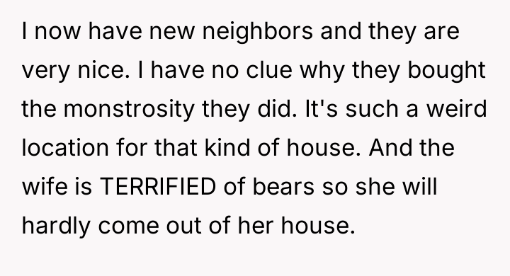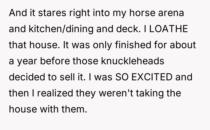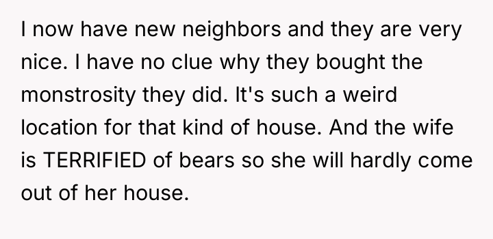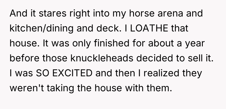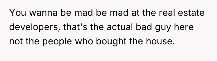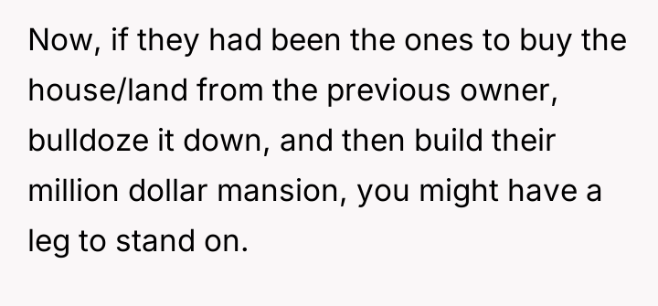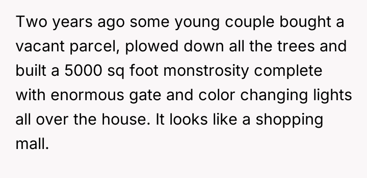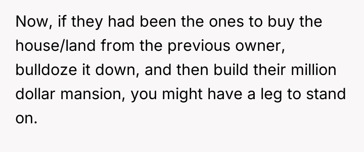 Was the OP justified in confronting the new neighbors with the statement that they 'got what they paid for,' given the destruction of a community asset, or did this reaction unfairly punish newcomers for legal construction? The debate centers on whether property rights and financial status supersede the established emotional and social fabric of an existing neighborhood.