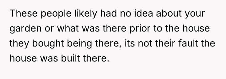 The original poster (OP) is clearly experiencing significant emotional distress rooted in the loss of a long-standing family legacy—the garden—due to new, intrusive development. The central conflict lies between the OP's deeply felt emotional connection to their property and community history, and the new neighbors' transactional expectation of immediate acceptance based solely on their significant financial investment in the area.