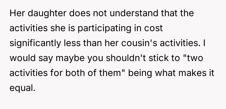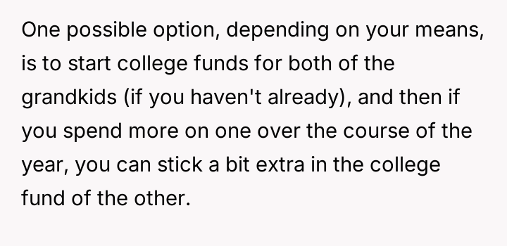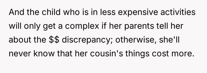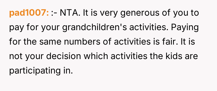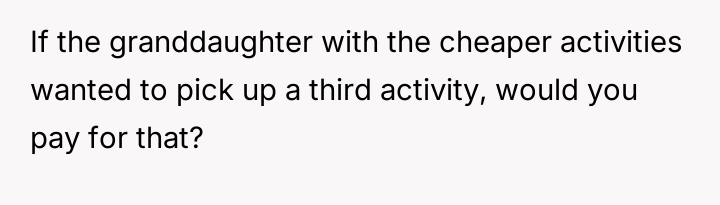Is the grandparent responsible for matching the monetary value of activities for both grandchildren, or does their willingness to support the interests of each child independently justify their current financial contributions, regardless of the cost difference?