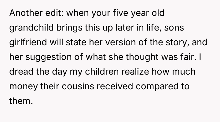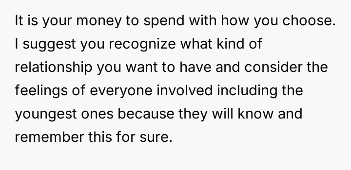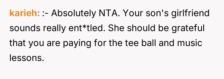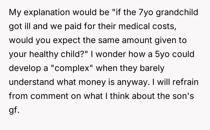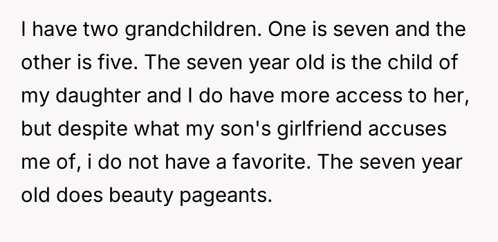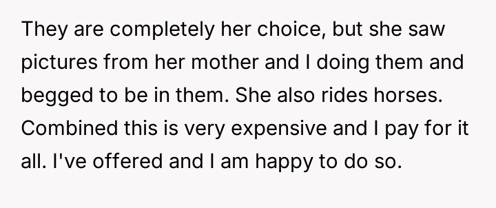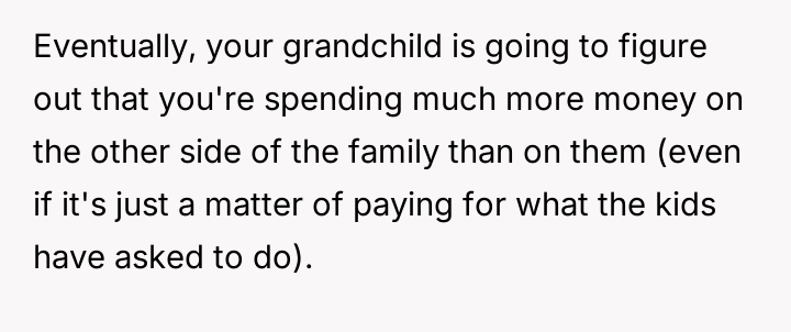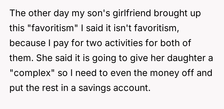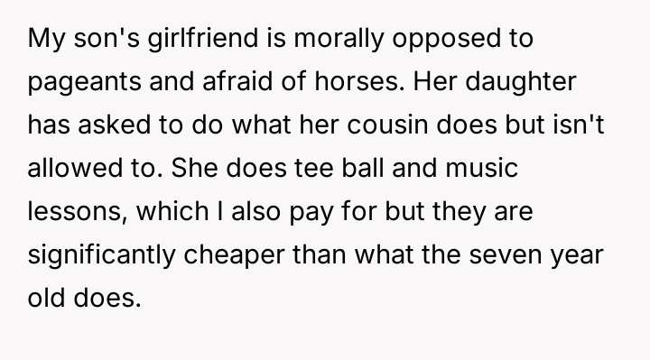 As renowned researcher Dr. Brené Brown explains, “Boundaries are the distance at which I can love you and me simultaneously.” The core issue here revolves around mismatched expectations regarding financial support and the projection of personal moral objections onto another relationship. The grandparent is funding the specific activities requested or chosen by each child (pageants/horses vs. tee ball/music lessons). The son's girlfriend is imposing her values (moral opposition to pageants) onto the grandparent’s relationship with her step-grandchild, while simultaneously demanding equal monetary compensation for her own daughter’s less expensive activities. This demand for exact financial parity, rather than equitable support for genuine interests, suggests the girlfriend is attempting to control the grandparent's resources and potentially displace her own feelings of exclusion or anxiety about her daughter missing out. The grandparent's reaction—laughing at the demand—indicates a significant breakdown in communication and validation. While the grandparent is not obligated to match dollar amounts, refusing to acknowledge the girlfriend's underlying feeling of unfairness (even if the feeling is misplaced) led to escalation. A more constructive future approach would involve affirming support for both children individually, perhaps explaining that the financial support is tied to specific, chosen activities, rather than offering a dollar-for-dollar comparison that invites further conflict over perceived slights.