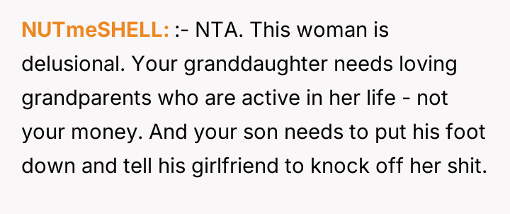 AITA for laughing at my son's girlfriend when she asked me to pay her compensation for the money I spend on my other grandchild?