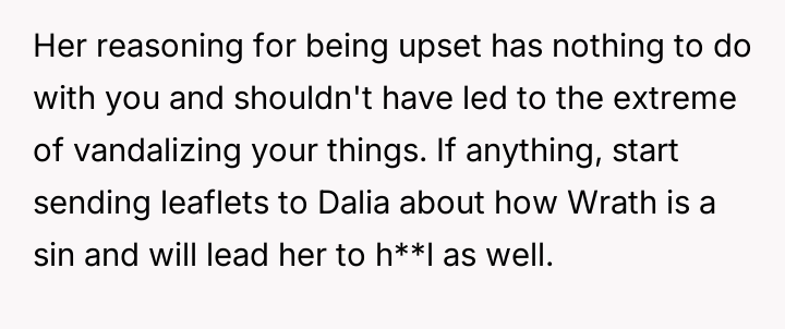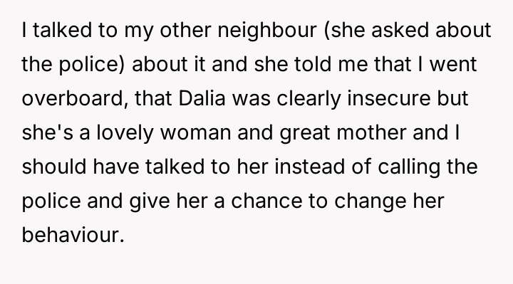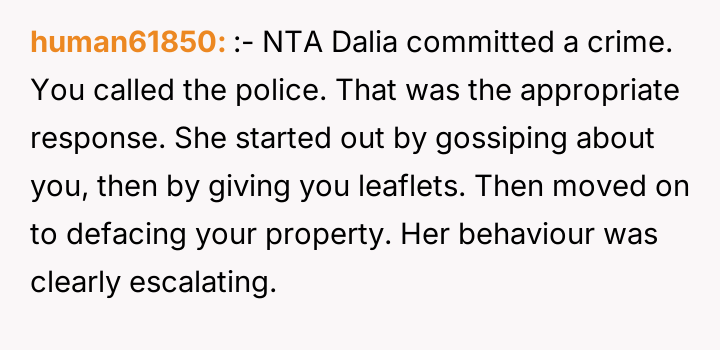 Was the OP justified in immediately involving the police upon discovering vandalism, or should she have provided the neighbor Dalia with a final chance to cease her destructive behavior following the initial confrontation? Does the severity of property damage outweigh the neighbor's claim of personal distress caused by the OP's profession?