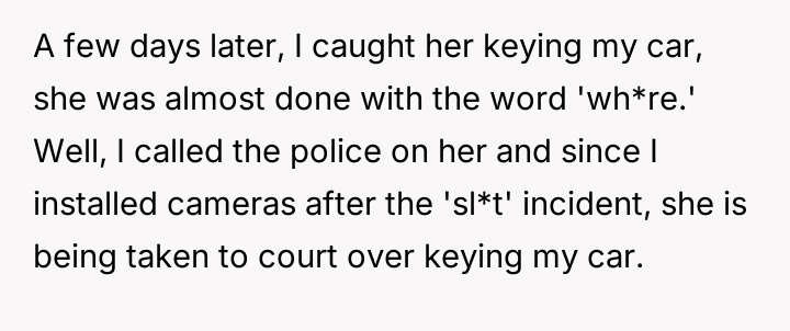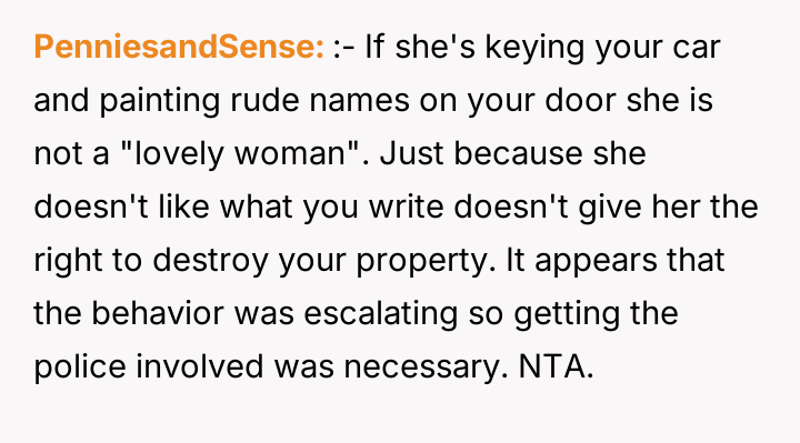 AITA for calling police on a neighbour after she keyed my car because of books I write