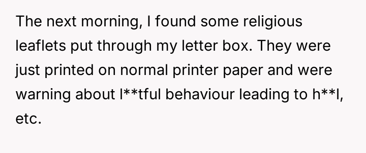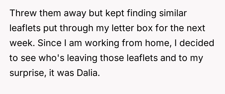 The husband, Roger, exhibited boundary violation through inappropriate flirting, suggesting an existing lack of respect for the OP’s personal space. Dalia’s subsequent actions—leaflet dropping, confrontation, and ultimately vandalism—represent an extreme overreach driven by moral condemnation and perhaps insecurity regarding her husband's interest. The escalation from unwelcome leaflets to keying a car constitutes criminal activity, which legally justifies police involvement regardless of prior interpersonal history. The neighbor suggesting the OP "went overboard" minimizes the seriousness of property destruction and victimizes the person whose property was attacked.