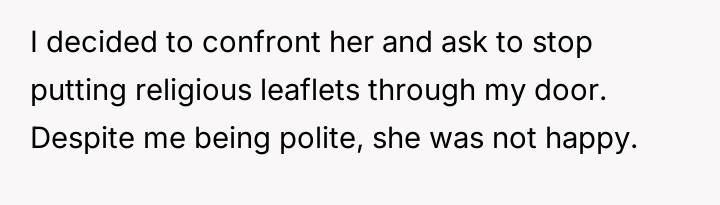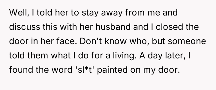 The original poster (OP) is facing a severe escalation of conflict after her private profession became public knowledge to her neighbors. Her initial attempt at polite confrontation regarding religious harassment was met with hostility, leading her to involve law enforcement when physical property damage and vandalism occurred. The central tension lies between the OP's right to privacy and professional life versus the neighbors' judgment based on moral and religious beliefs, culminating in the OP prioritizing legal protection over further interpersonal negotiation.