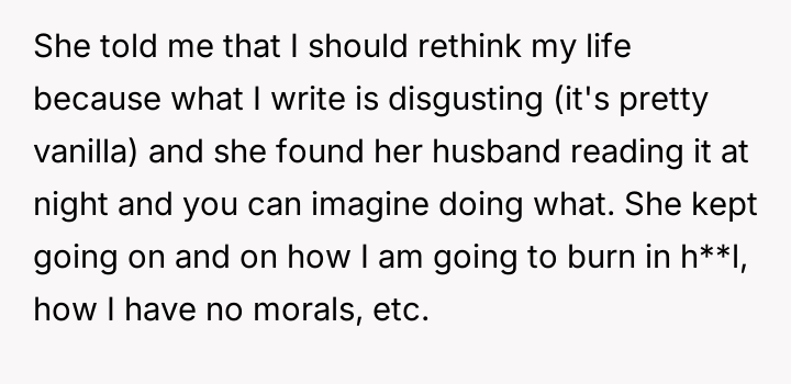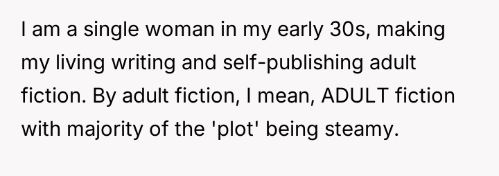 In the quiet solitude of her life, a single woman in her early thirties carved out a unique existence, weaving steamy adult fiction stories under a pen name, a secret world she kept close to her heart. Surrounded by families and retirees, her life was a delicate balance of privacy and independence, her true self known only to a trusted few, far from the curious eyes of neighbors.