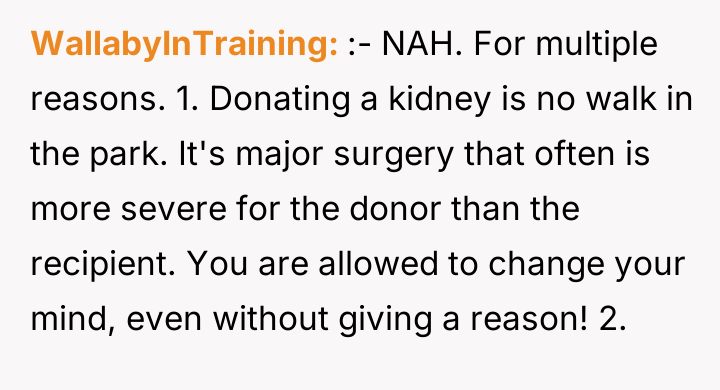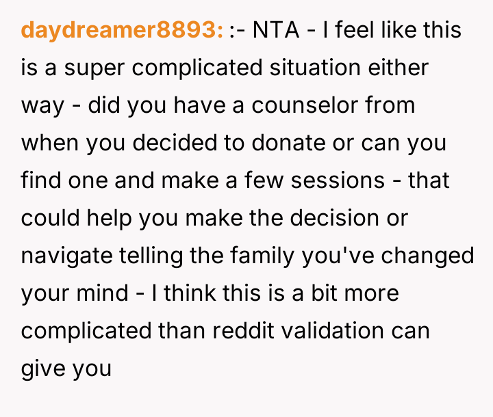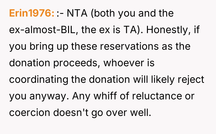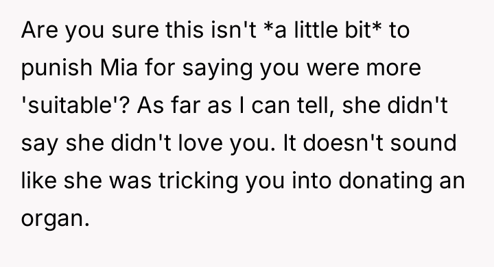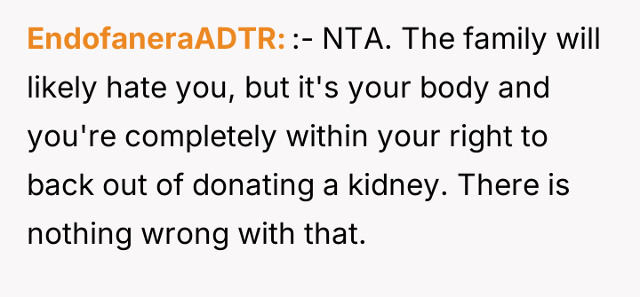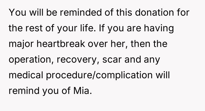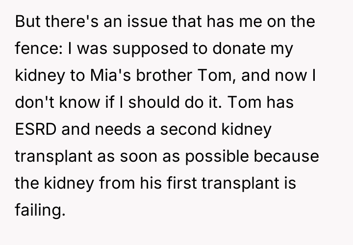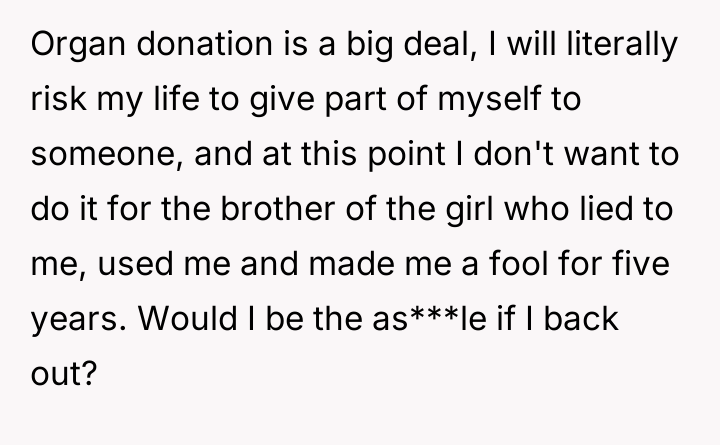 As renowned bioethicist Arthur Caplan explains, “Informed consent, particularly for living organ donation, must be entirely voluntary and free from coercion or undue emotional pressure; this consent can be withdrawn at any time, for any reason, before the procedure.” The situation presents a profound conflict between personal integrity, emotional recovery, and a significant altruistic commitment. The poster was motivated to donate based on the perceived future relationship with Mia's family; this foundation has been completely invalidated by Mia's admission of using the poster. Psychologically, continuing with the donation now requires the poster to perform a major physical sacrifice for individuals connected to the source of their pain, which can impede healing and create long-term resentment. From an ethical standpoint regarding organ donation, consent is revocable. The poster has every right to withdraw, as the prerequisite emotional context for the gift—the belief in a future family unit—no longer exists. The poster’s actions in ending the relationship were appropriate given the severe breach of trust. While the need of Tom (the brother) is critical, forcing the poster to proceed with a major, life-altering surgery under these circumstances would violate the principle of respecting personal autonomy and bodily integrity. The constructive path forward is clear: the poster should formally and immediately notify the transplant coordinator of their decision to withdraw consent, prioritizing their own physical safety and emotional recovery.