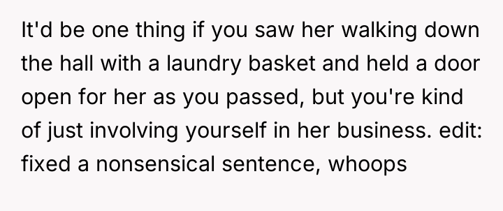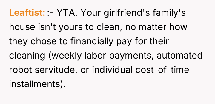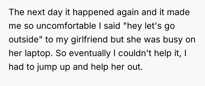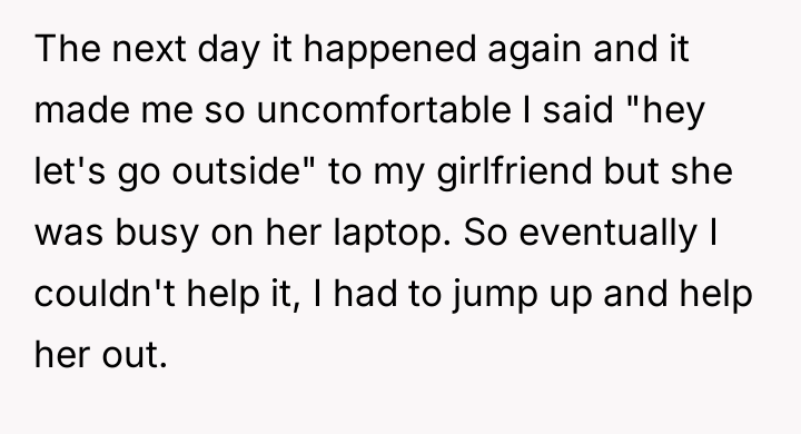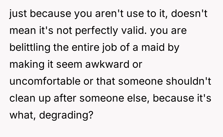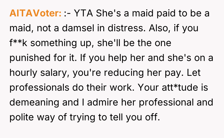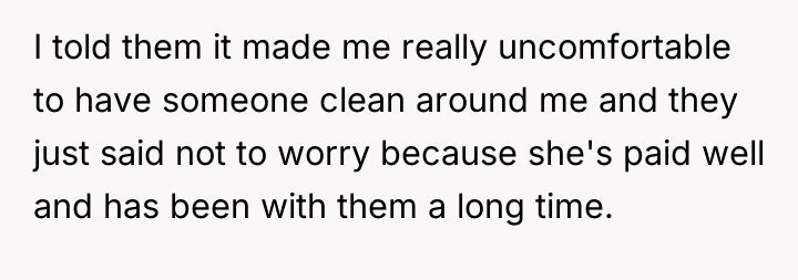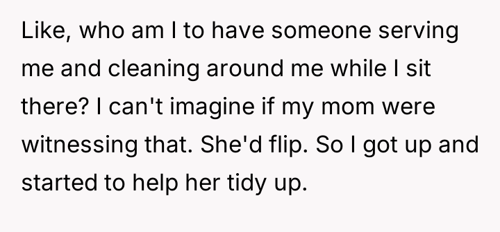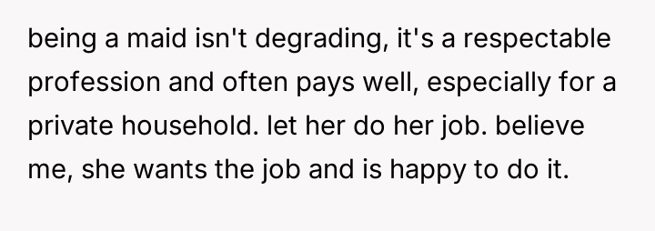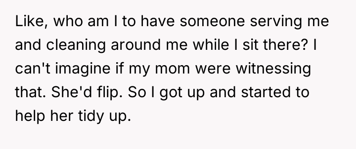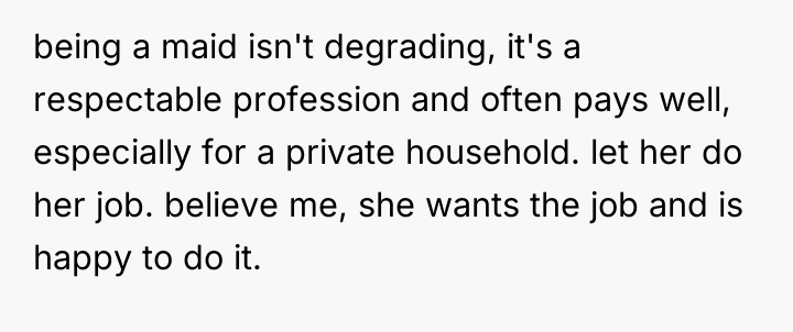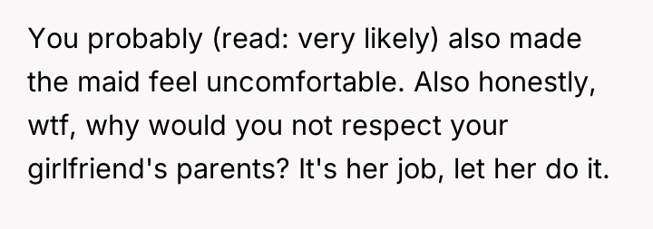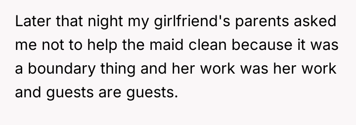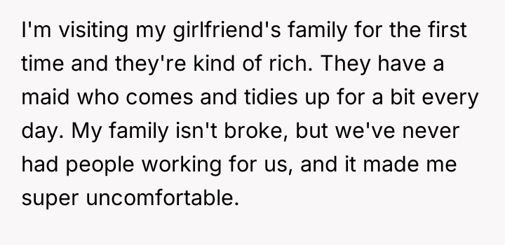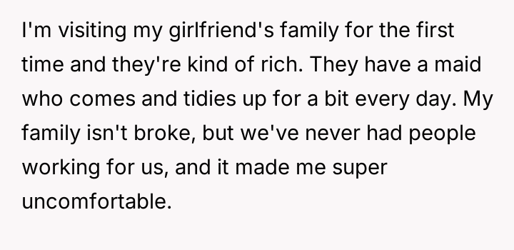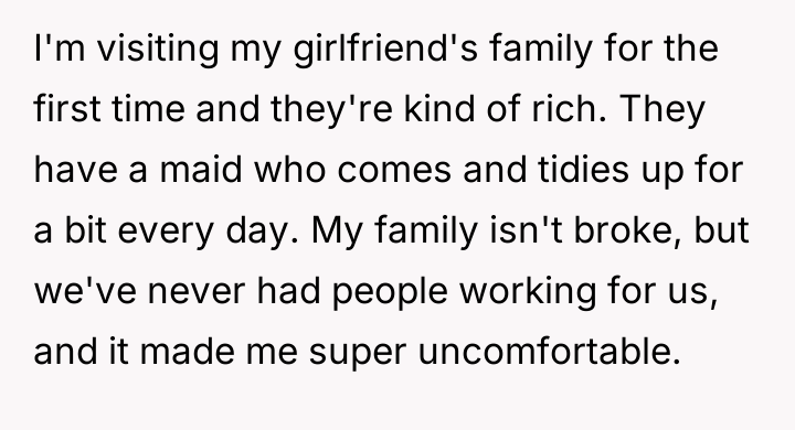 The original poster (OP) experienced significant discomfort due to the presence of hired domestic help in their girlfriend's affluent family home, leading them to repeatedly intervene and assist the maid against the explicit wishes of the hosts. The central conflict lies between the OP's deeply ingrained personal values regarding service, class, and humility, and the hosts' established boundaries concerning their domestic arrangements and the professional role of their employee.