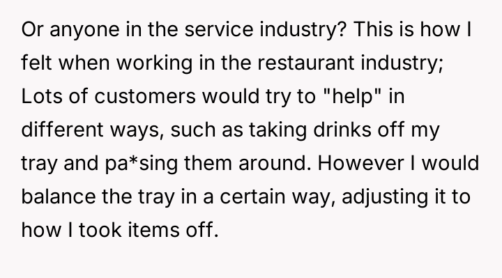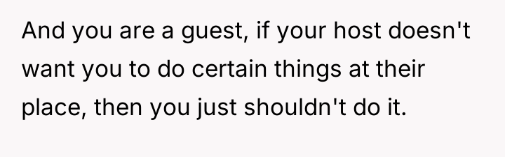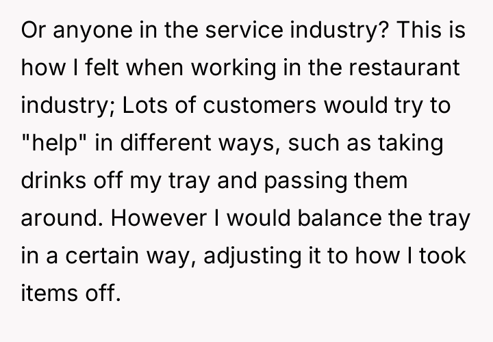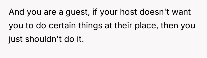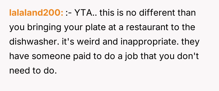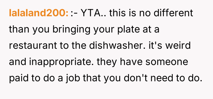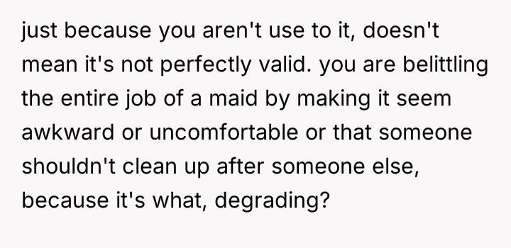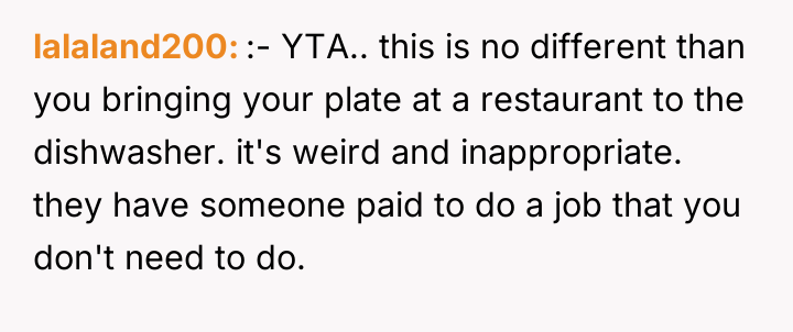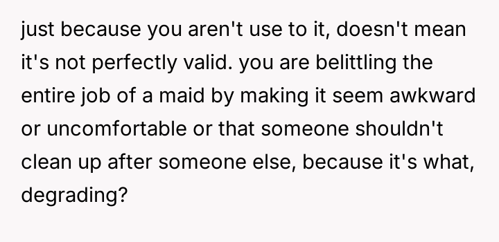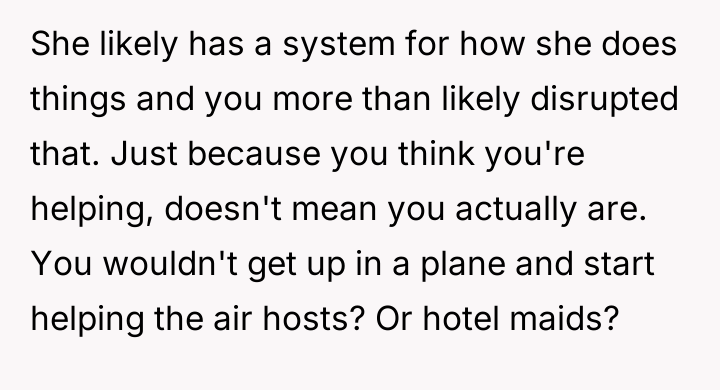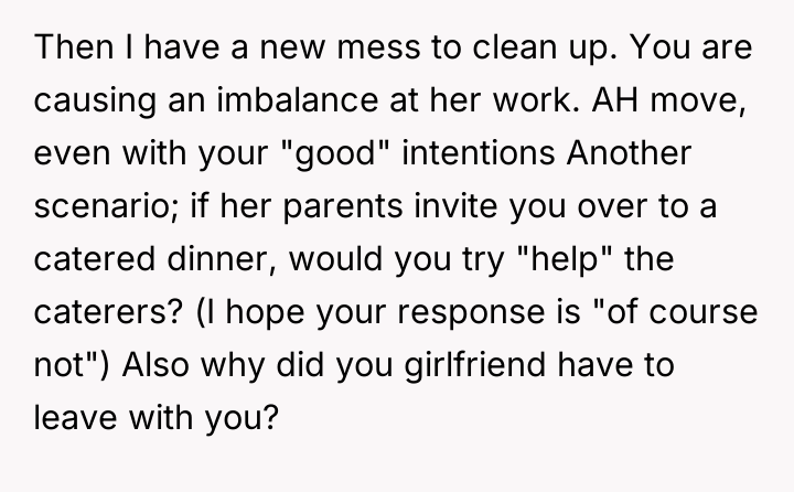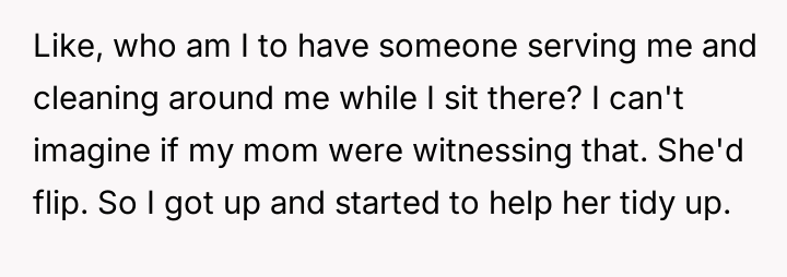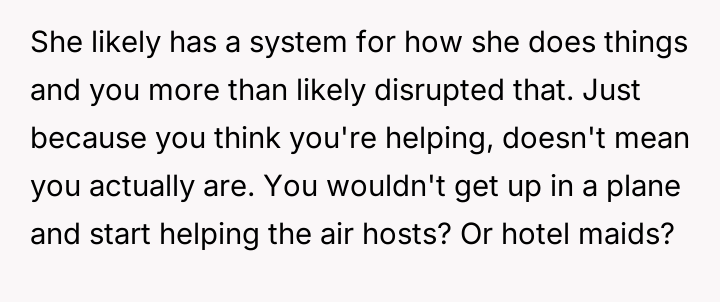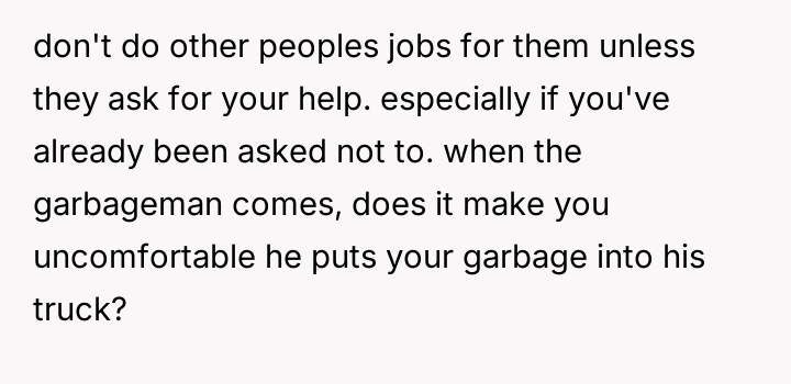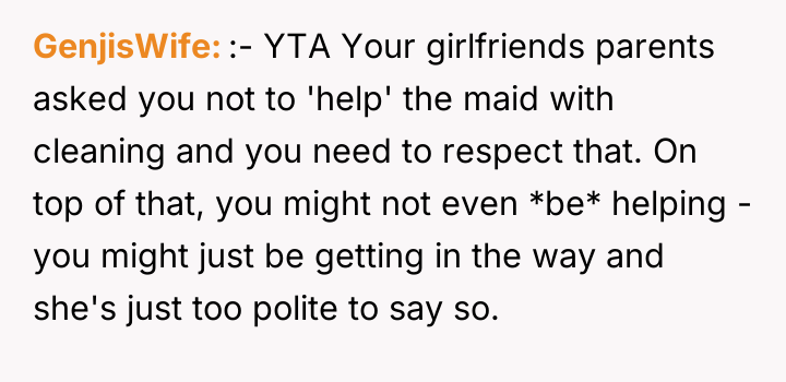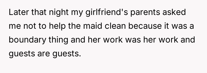 As renowned researcher Dr. Brené Brown explains, “Boundaries are the distance at which I can love you and me simultaneously.” In this situation, the hosts attempted to set a clear boundary defining the professional scope of the maid's employment and the guest's role, which was intended to maintain comfort and order within their specific household dynamic. The OP's motivation stems from a strong sense of personal ethics, likely rooted in their own family's socio-economic background, where having paid help is unfamiliar and assisting others is an automatic response. However, by repeatedly overriding the hosts' request, the OP inadvertently disrupted the established power dynamic and professional structure. The hosts viewed the maid's work as a service relationship where guests should not interfere, regardless of how awkward the guest felt. The OP's actions, while stemming from good intentions (a desire to reduce perceived inequality or burden), were experienced by the hosts as a breach of their stated rules and a potential undermining of their employee’s professional role. The OP was incorrect in repeatedly disregarding the explicit instructions of the hosts. While their discomfort was valid, the appropriate action when visiting another's home is to respect their established rules, even if those rules clash with personal instincts. To handle this better in the future, the OP should communicate their discomfort privately to their girlfriend first, asking for context or advice, rather than taking direct action that contradicts the hosts' stated wishes regarding their staff.